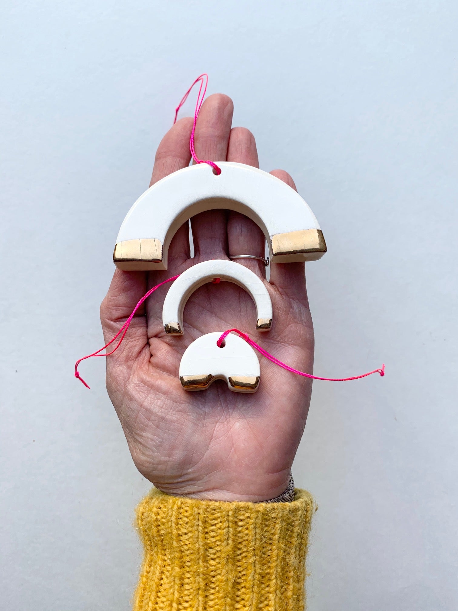 3 white stoneware handmade ceramic ornaments with dazzly gold luster glaze added! these ornaments are strung on hot pink silk cord cord & the ceramic pieces are cut, cleaned, painted, glazed & fired three times by me. all pieces are handmade by me in my ceramic studio & i use only non-toxic, lead free glazes.