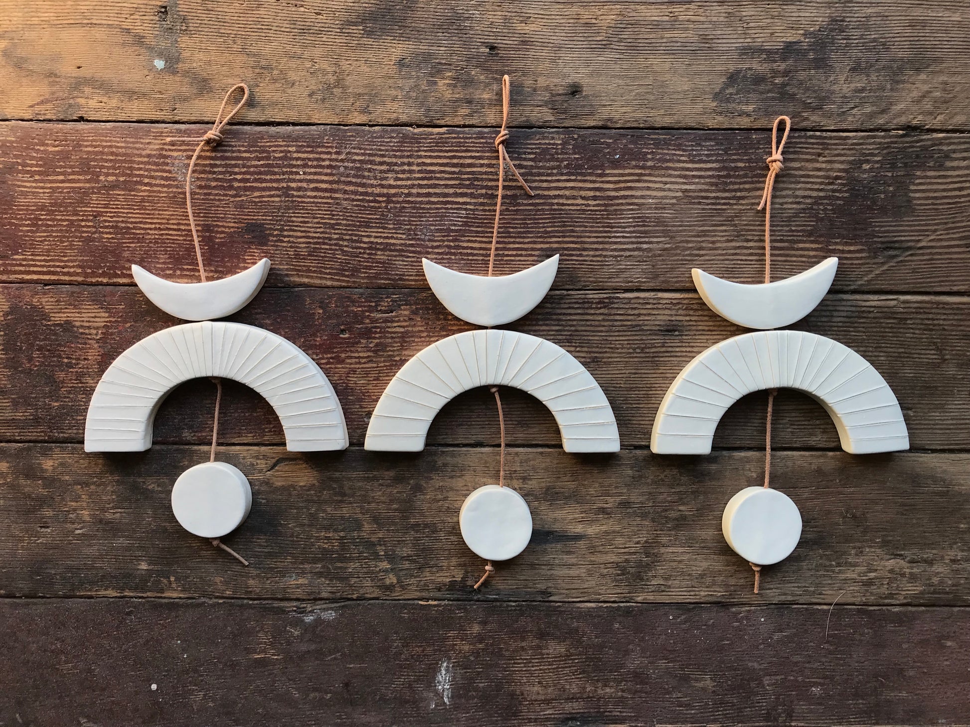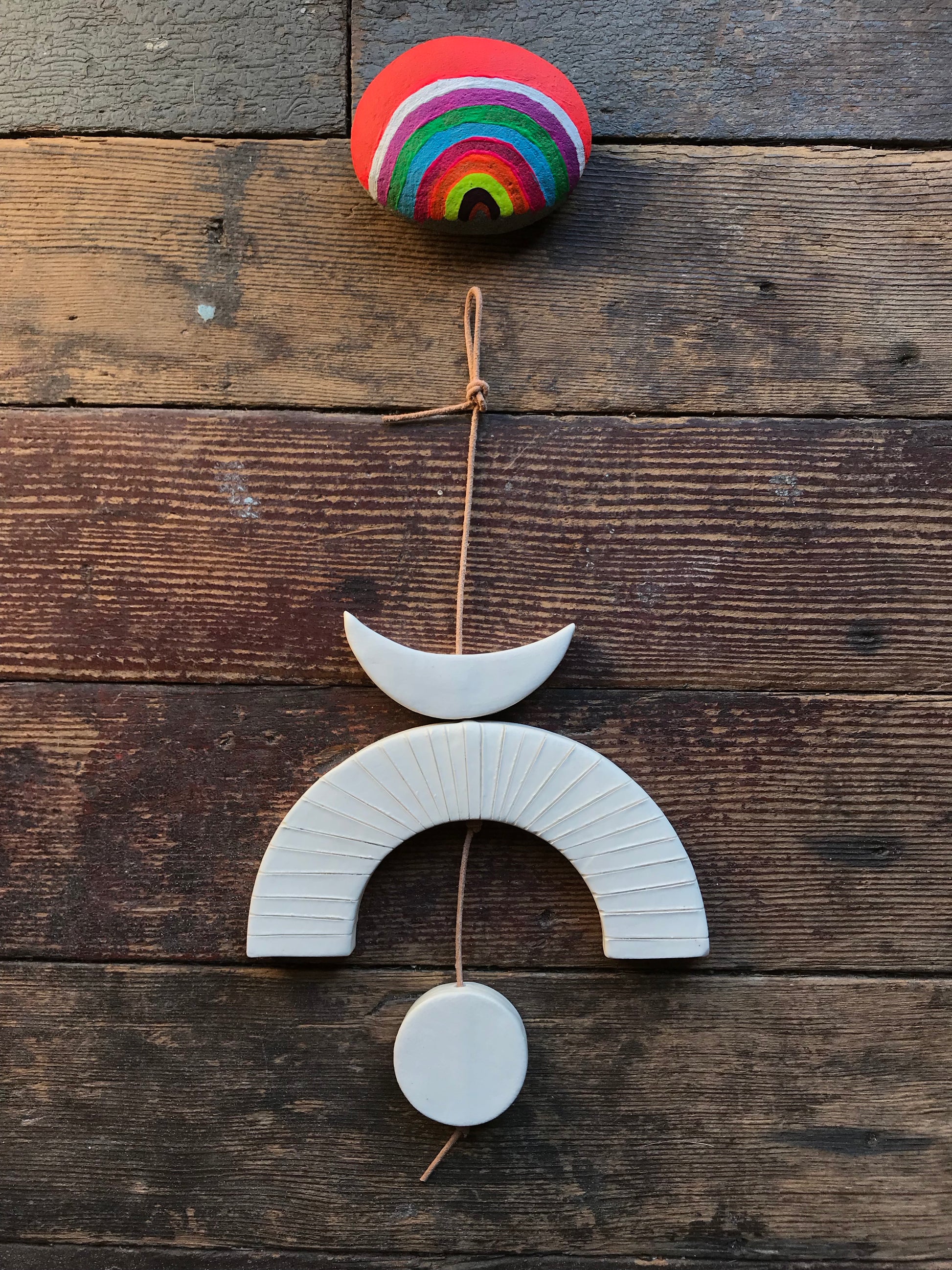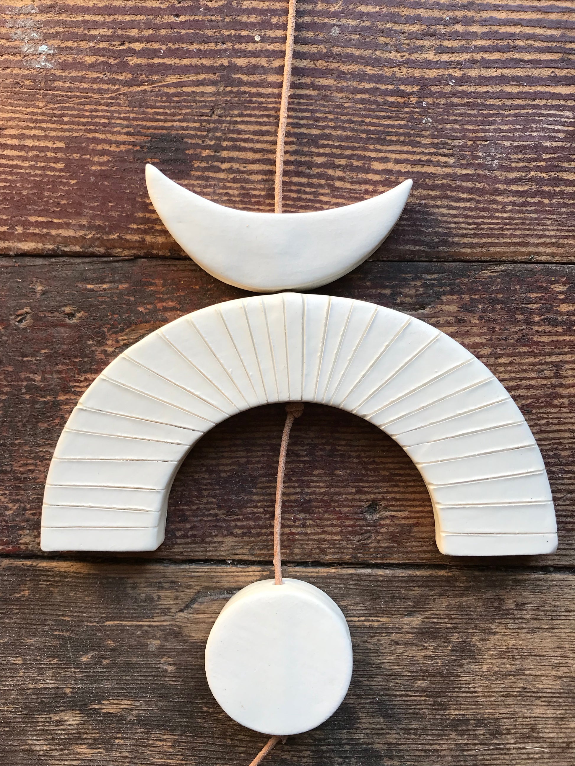 each & every piece of these wall hangings are cut, cleaned, fired twice, glazed by hand, designed & strung by me. the white pieces are all fairly chunky & feel so great to the touch with the minimal matte glaze. this piece is strung on strong leather cord & they all come ready to hang.  all of my glazes are non-toxic.