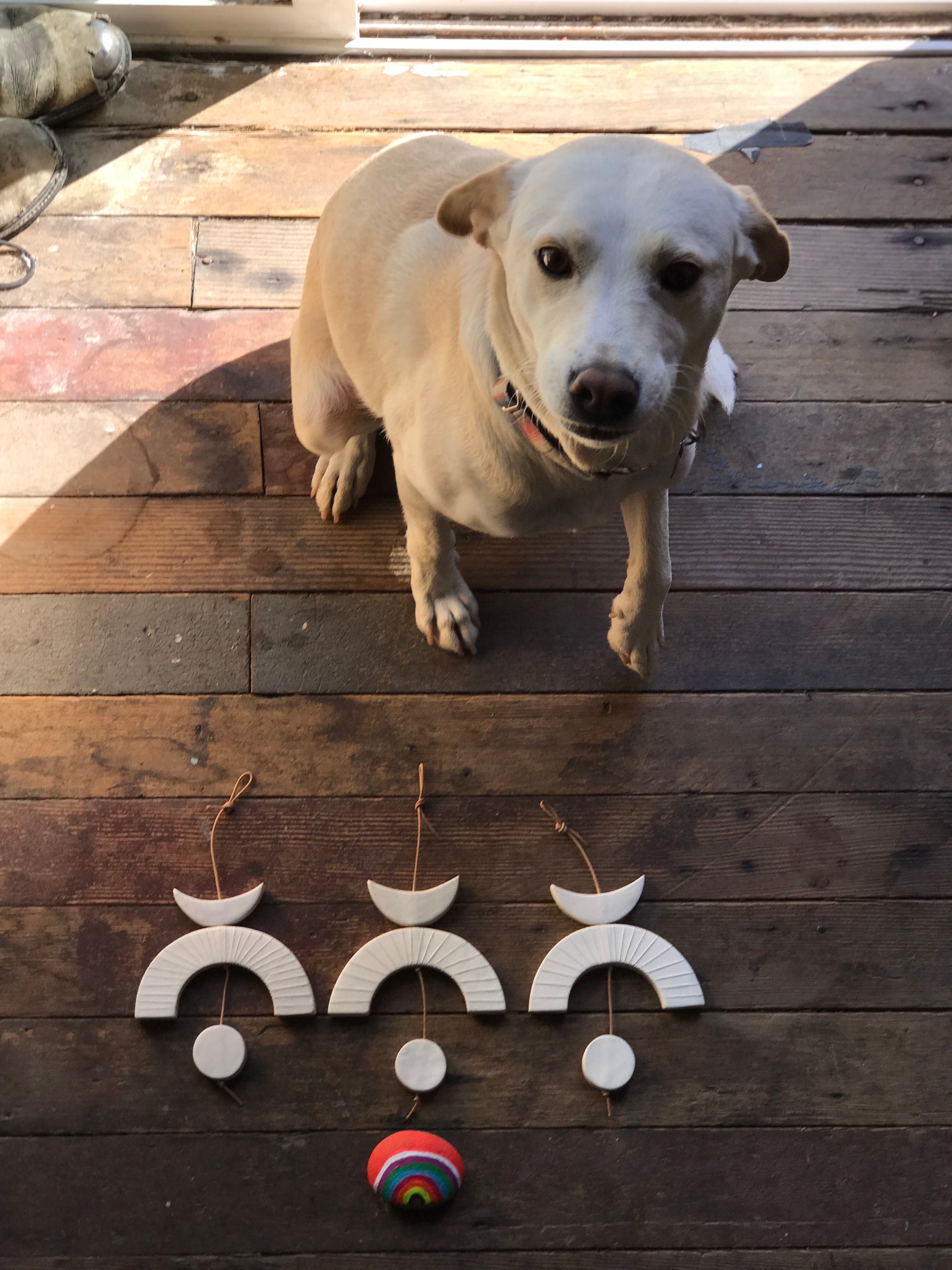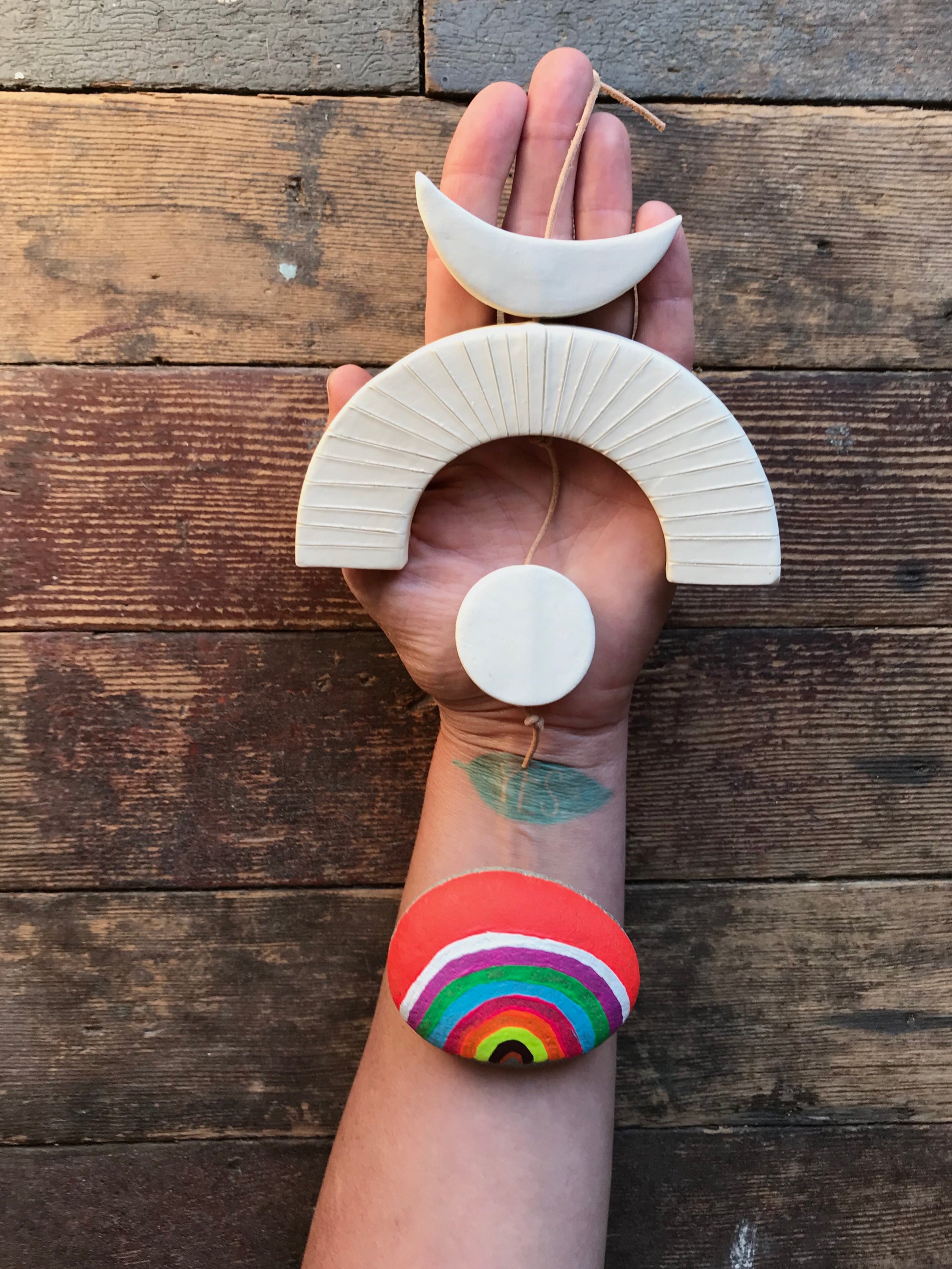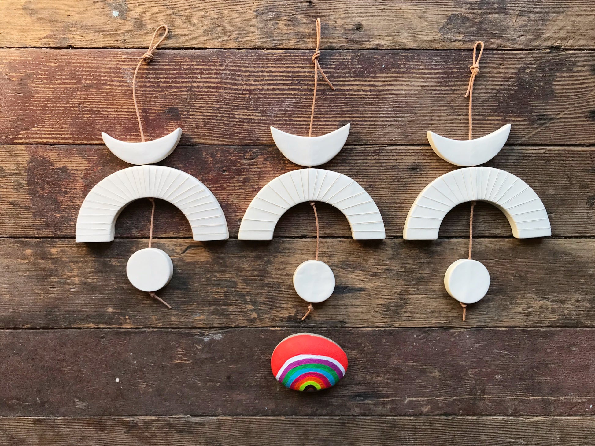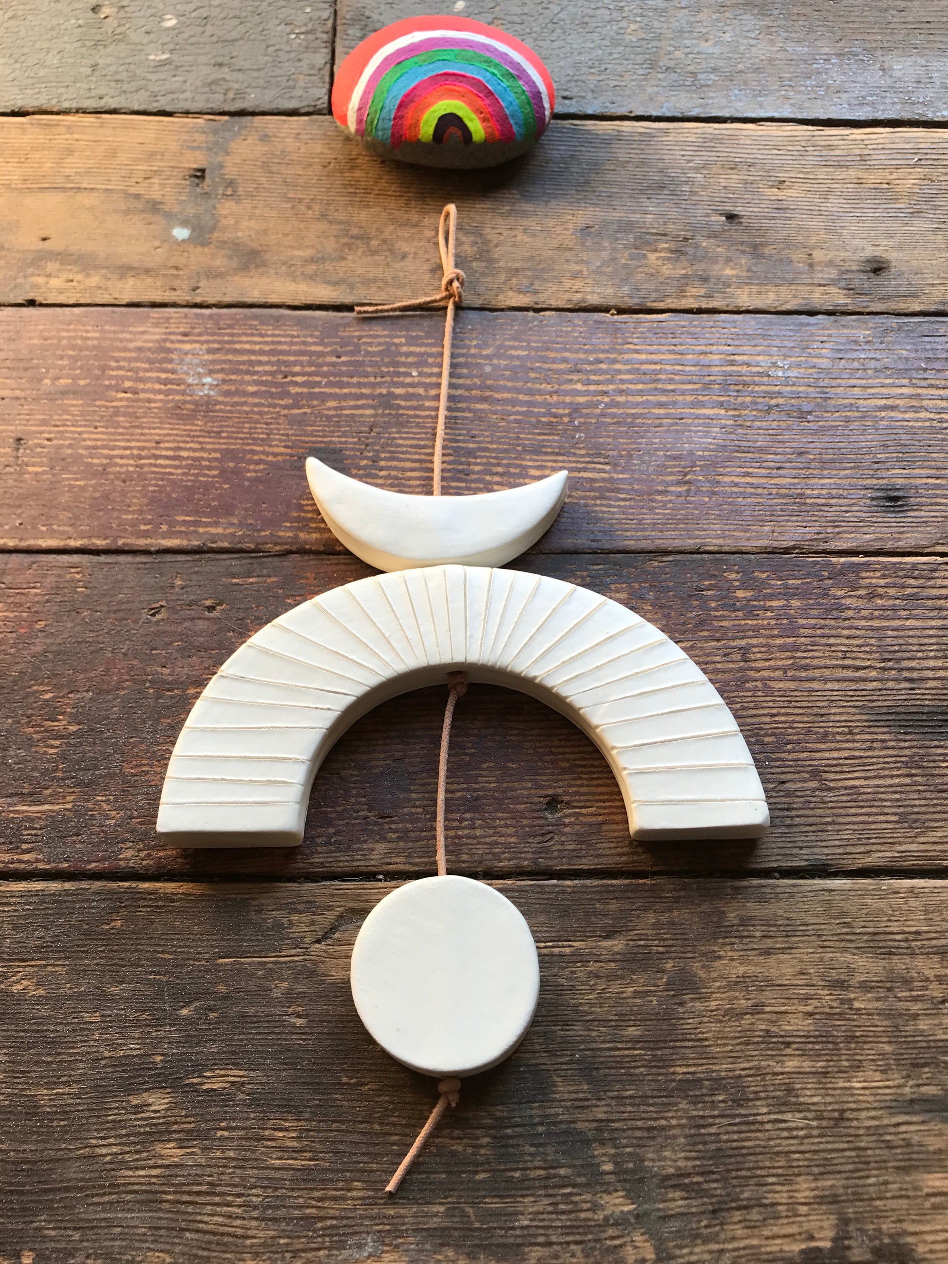 each & every piece of these wall hangings are cut, cleaned, fired twice, glazed by hand, designed & strung by me. the white pieces are all fairly chunky & feel so great to the touch with the minimal matte glaze. this piece is strung on strong leather cord & they all come ready to hang.  all of my glazes are non-toxic.
