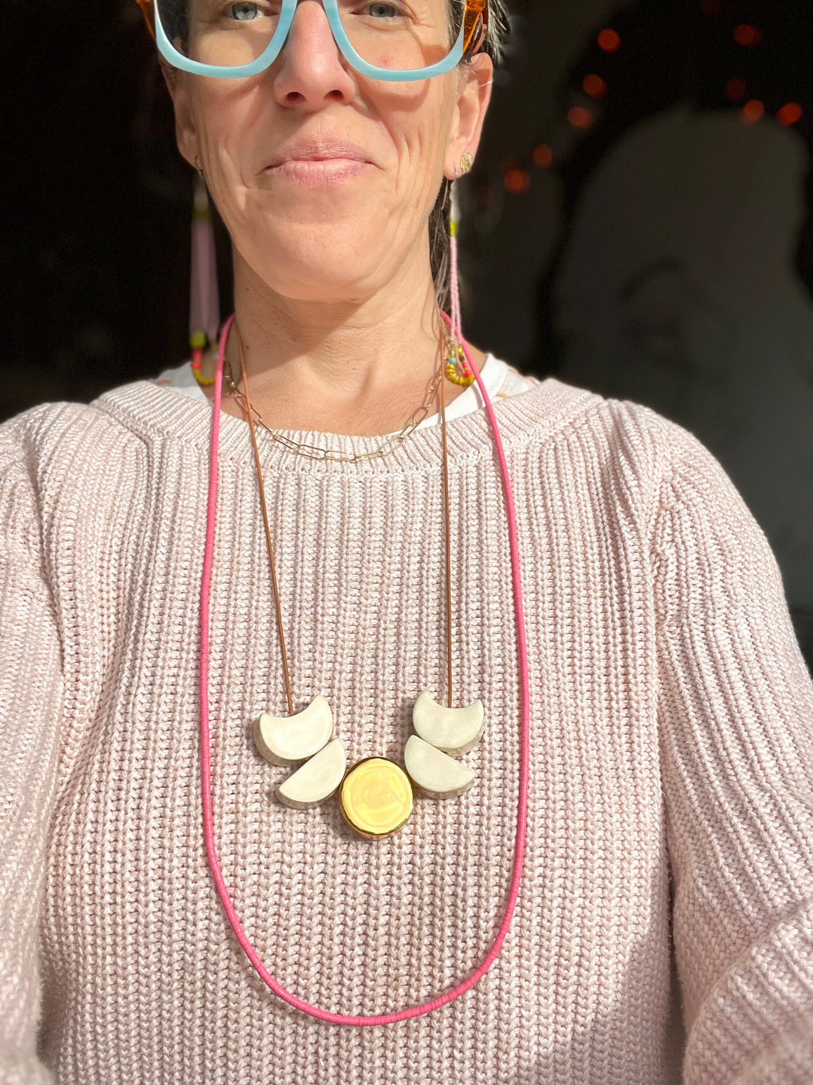 a riff off my long weekend moon phases wall hanging so you can wear them! a lovely chunky handmade ceramic necklace. this pretty piece is strung on a leather cord & the ceramic pieces are glazed in a pretty white color. each piece & glaze will vary slightly as they are all handmade & sometimes specks & other magical glaze bits give variation to the pieces.  the gold is a beautiful lustre & has real gold in the glaze.  each piece is handmade by me in my ceramic studio & i use only non-toxic, lead free glazes.