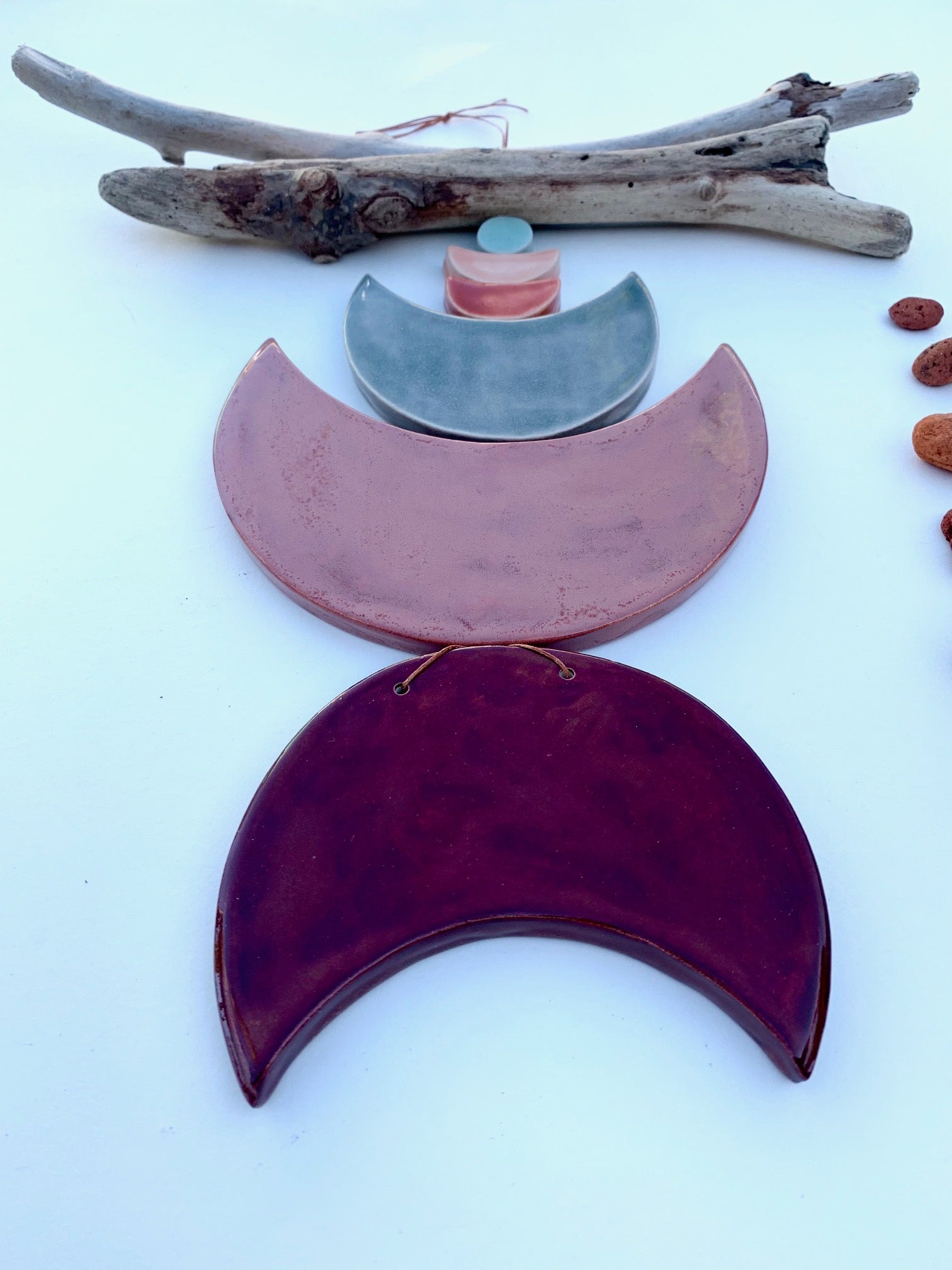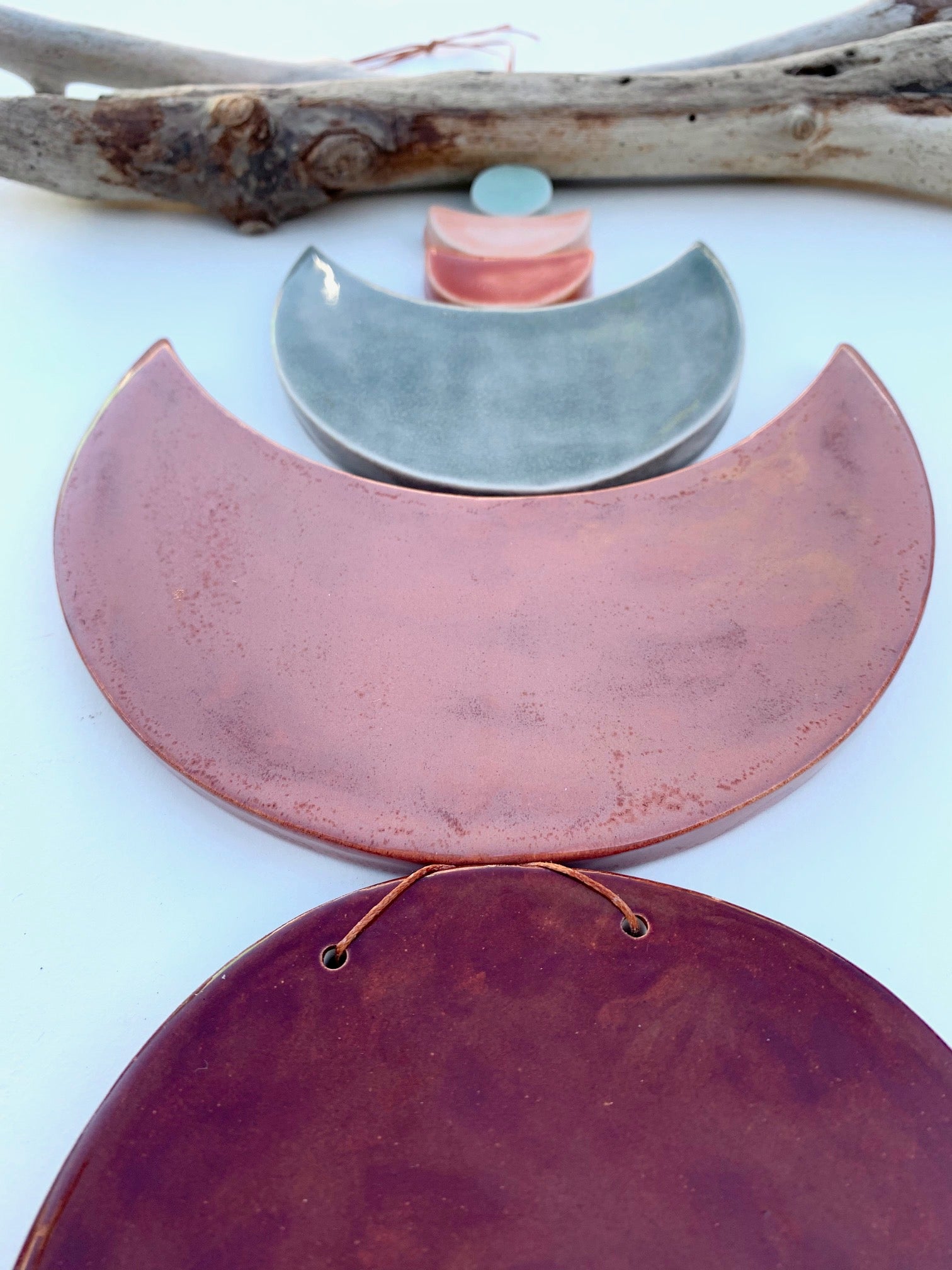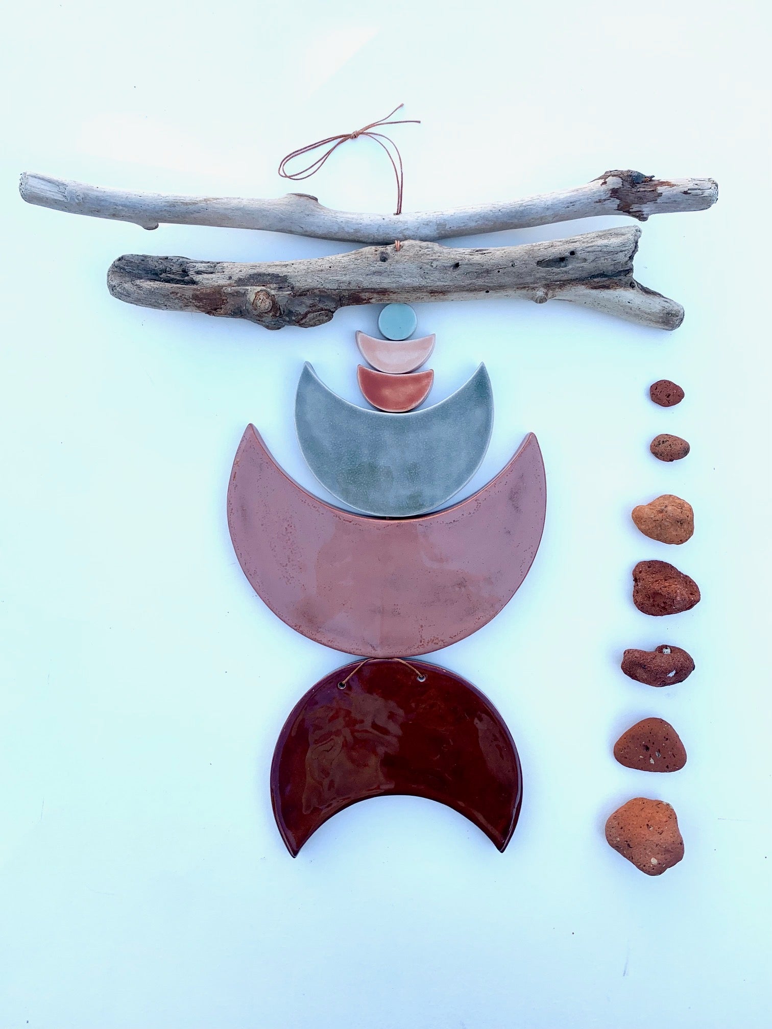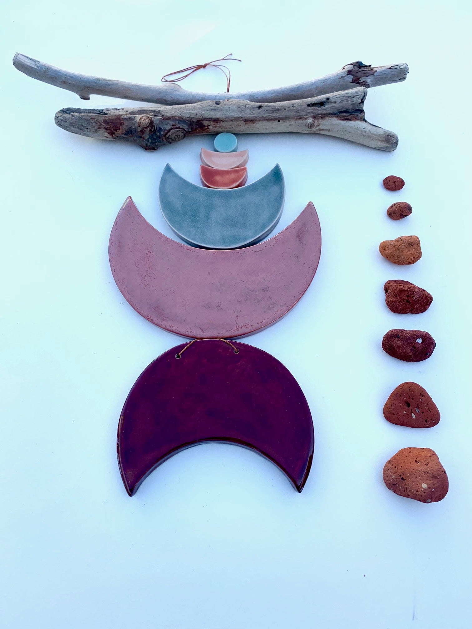 each & every piece of these wall hangings are cut, cleaned, sanded, designed, fired twice, & glazed by hand. the moon, desert & sea pieces are all fairly chunky & glazed with beautiful, full range colors; some with crackles, some with speckles & all unique. this piece is strung on strong waxed linen cord & come ready to hang.  these pieces range in length from 8-24".  all of my glazes are non-toxic. some ocean pieces have collected california beach driftwood added as well.