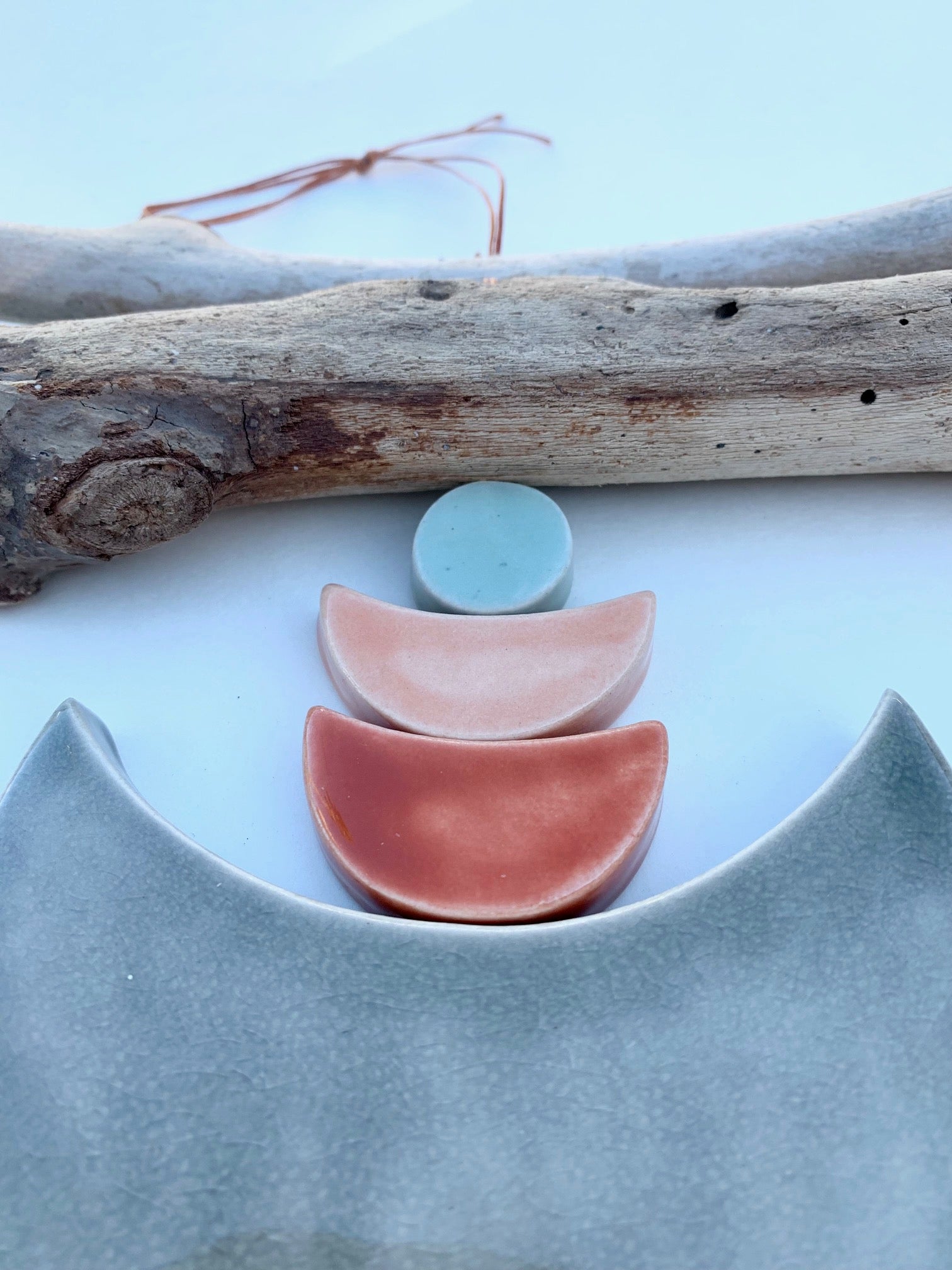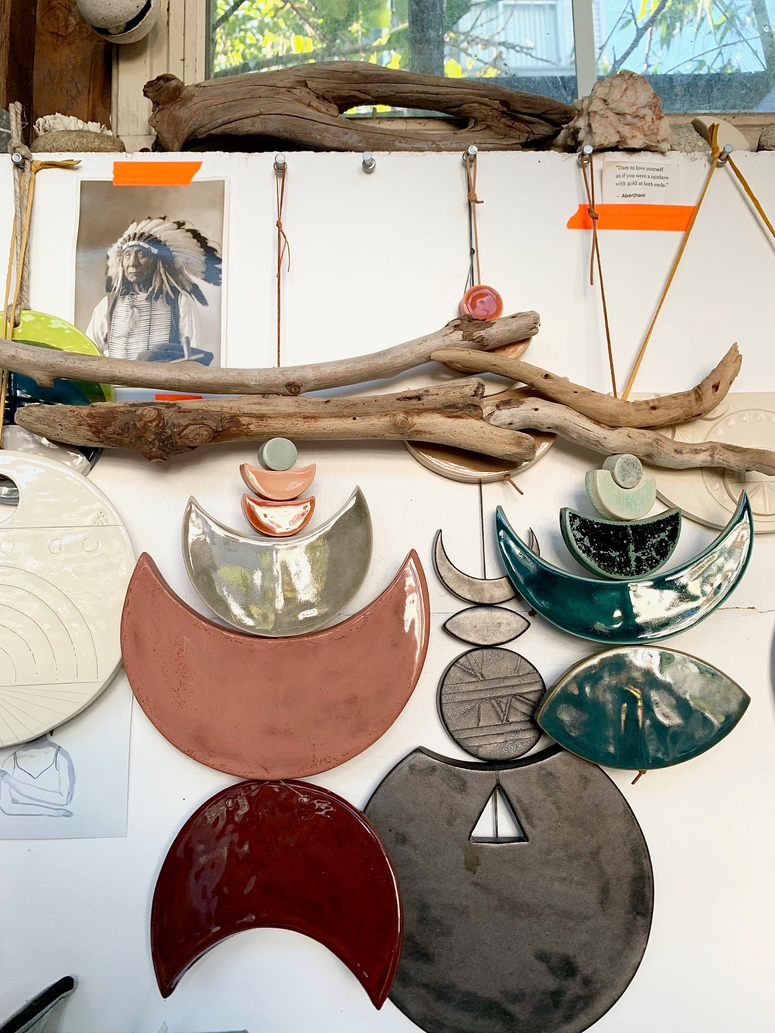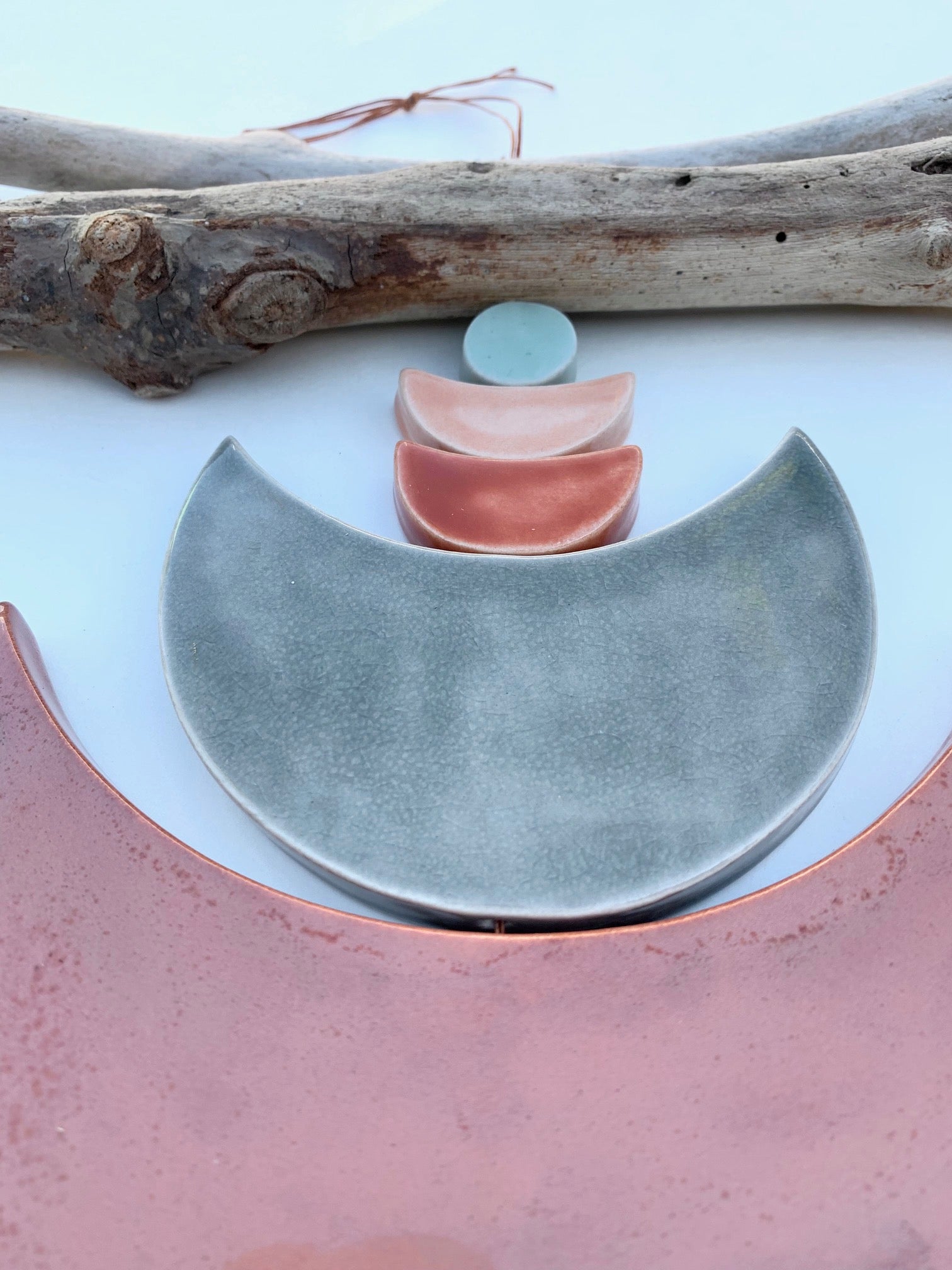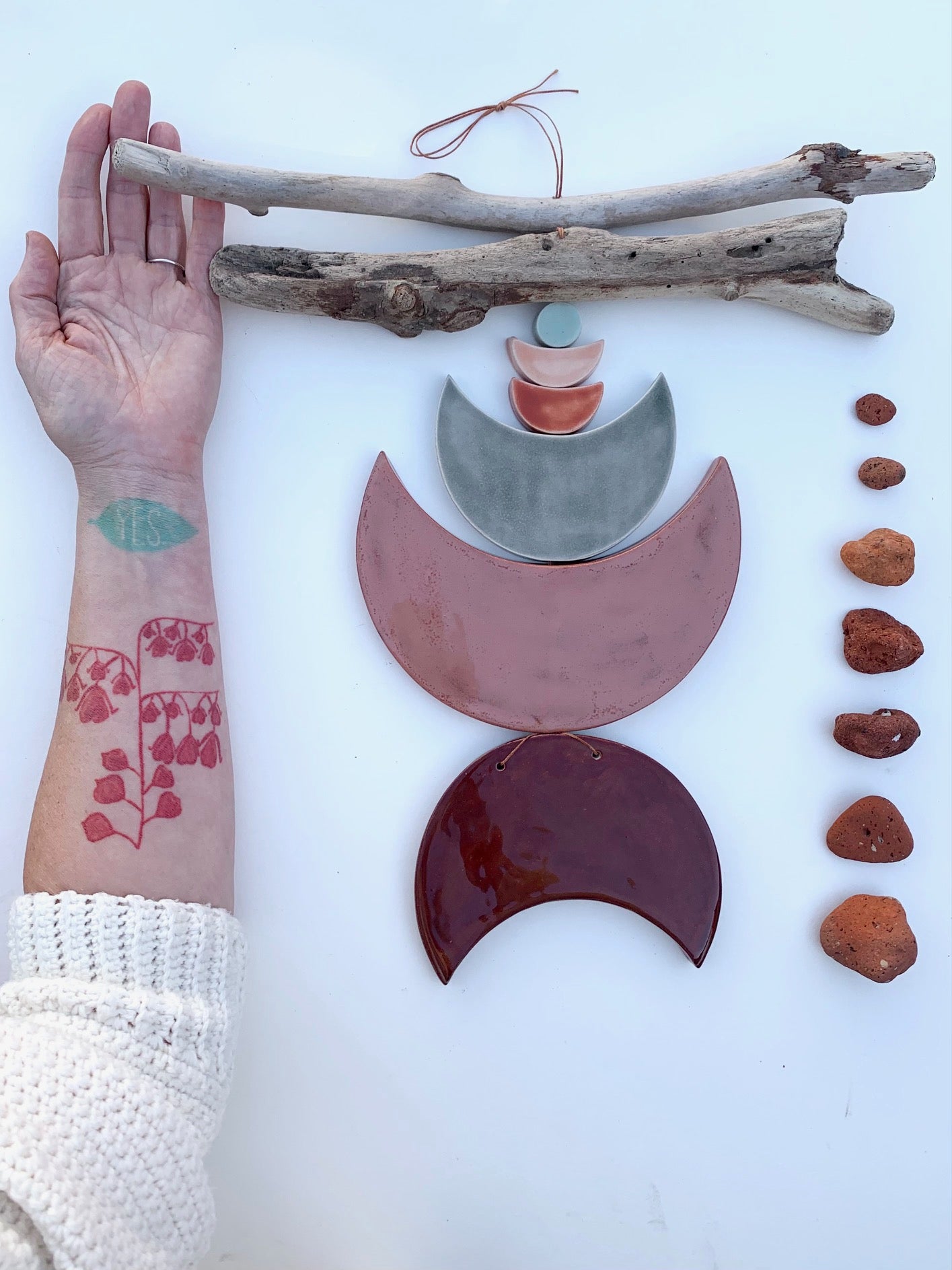 each & every piece of these wall hangings are cut, cleaned, sanded, designed, fired twice, & glazed by hand. the moon, desert & sea pieces are all fairly chunky & glazed with beautiful, full range colors; some with crackles, some with speckles & all unique. this piece is strung on strong waxed linen cord & come ready to hang.  these pieces range in length from 8-24".  all of my glazes are non-toxic. some ocean pieces have collected california beach driftwood added as well.