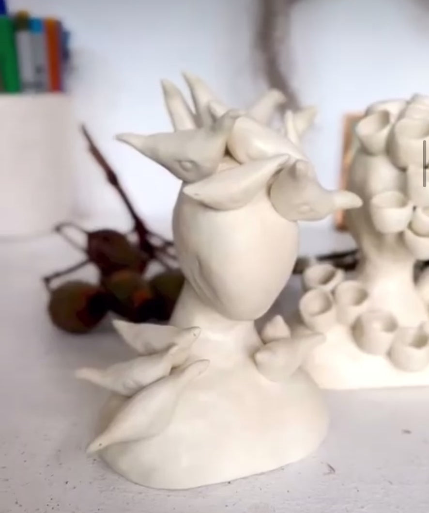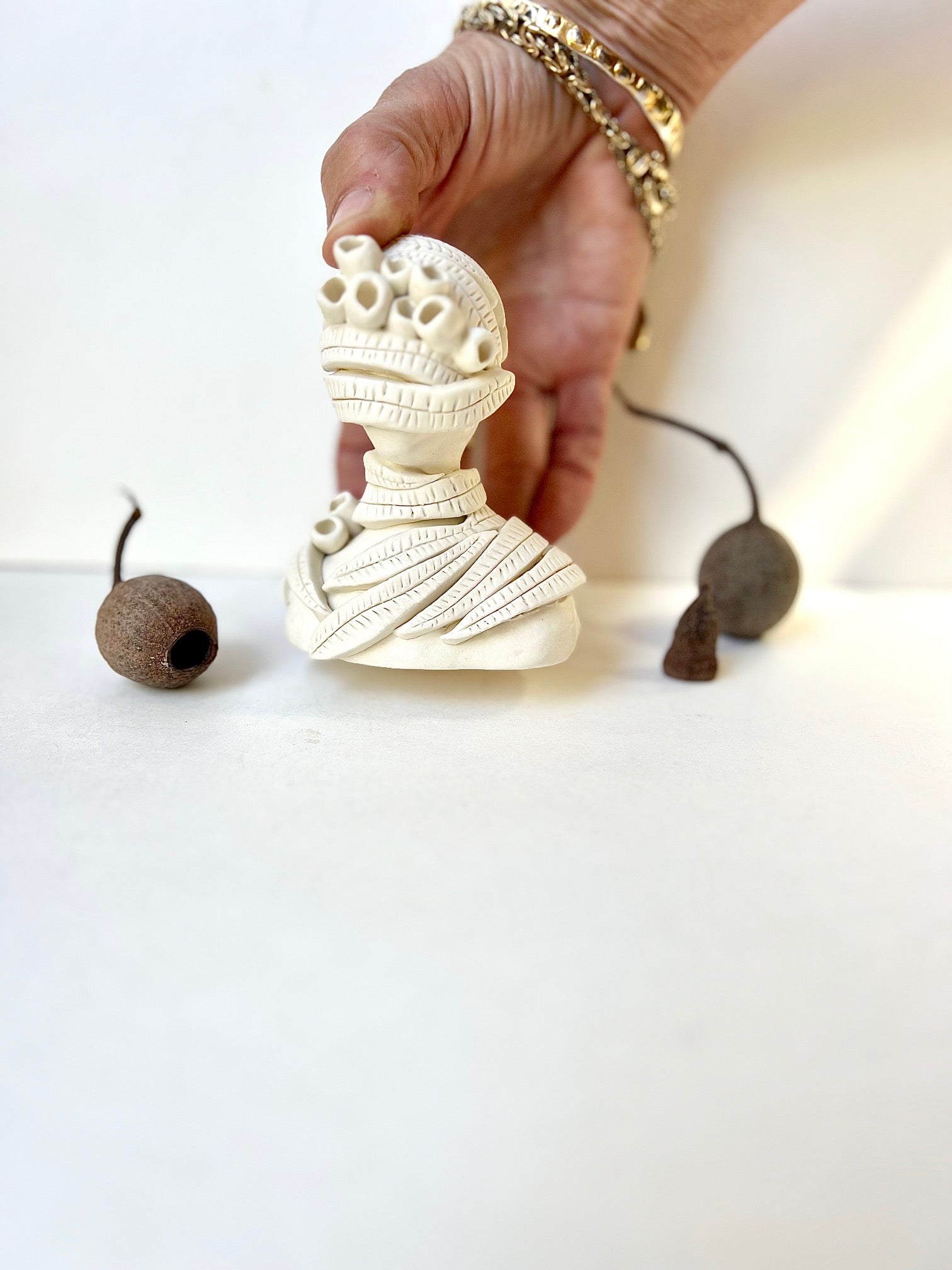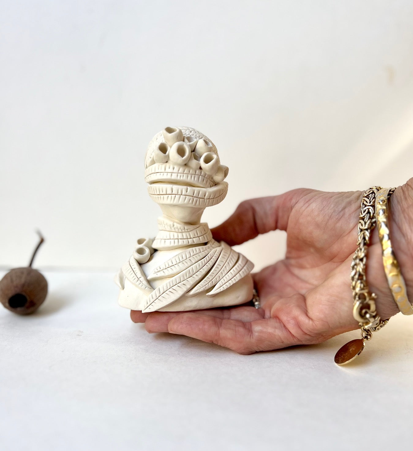 each & every one of these statuette sculptures are hand-formed with many detailed clay objects that are hand sculpted & slip set on; then cleaned, incised with fine designs, fired twice, sanded, & glazed by hand. these special works take many, many hours to design & make.  the meticulous, meditative nature of getting the repeated objects *just so* is part of the beauty & realization of the lengthy sacred times these take.  the statuettes weight feel lovely in the hand & the white matte glaze used on the majority of them is a joy to feel. these sculptures are meant to evoke thoughtful feelings, memories, inspiration, musings, dreamy inroads in your day, & more.  they will sit well with your other meaningful objects on display.  i absolutely love making these busts & attaching different hand formed natural clay objects that speak to me, objects that have come out of my head & other pieces that lend a way to think more freely on what might be happening for these head pieces.