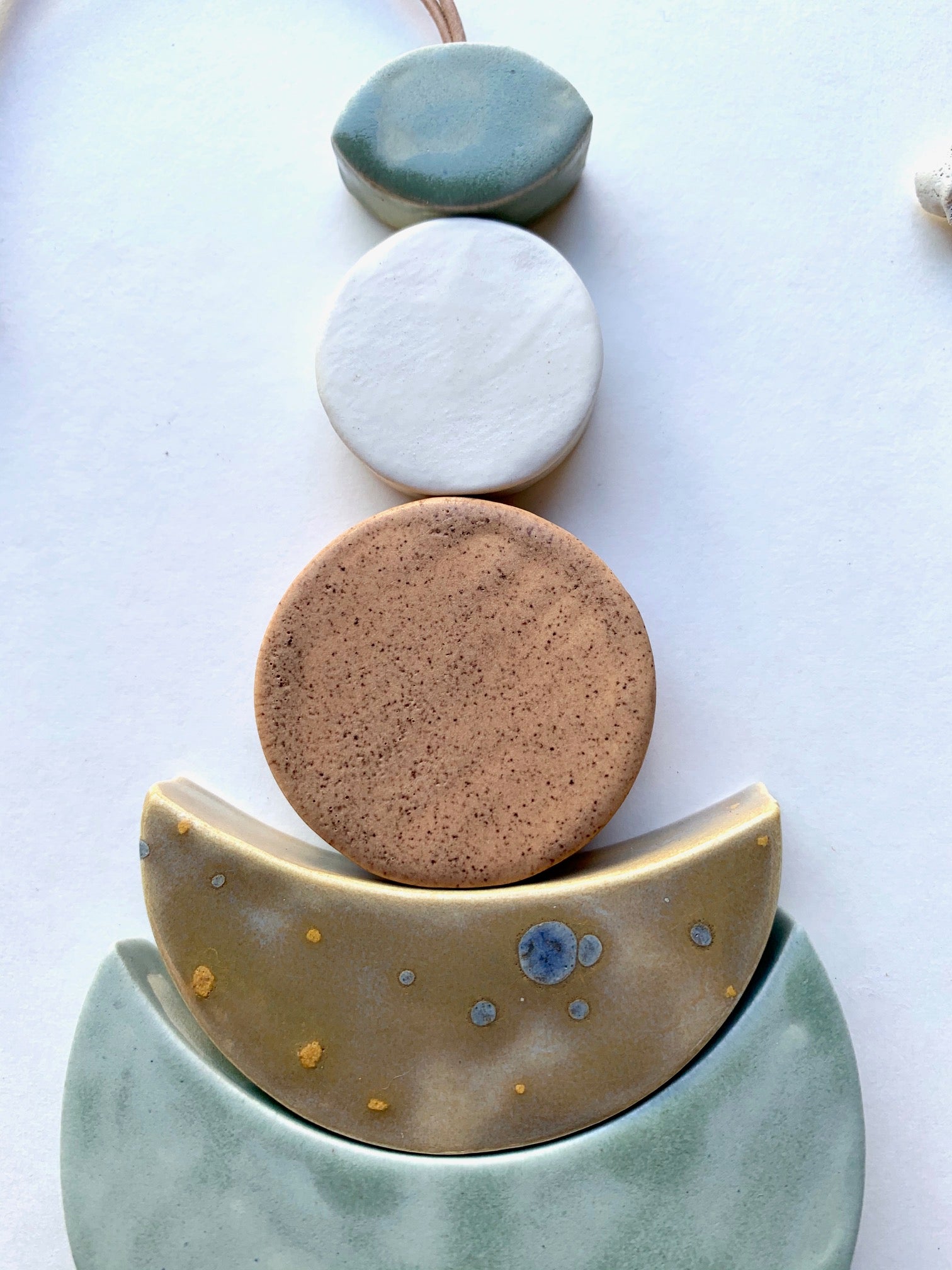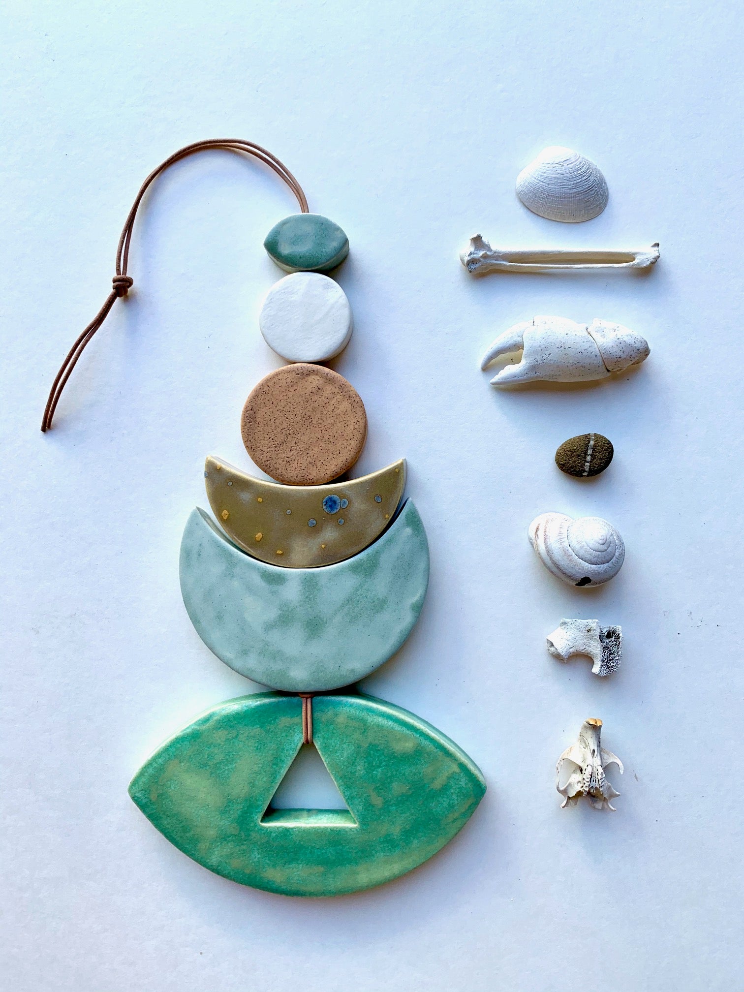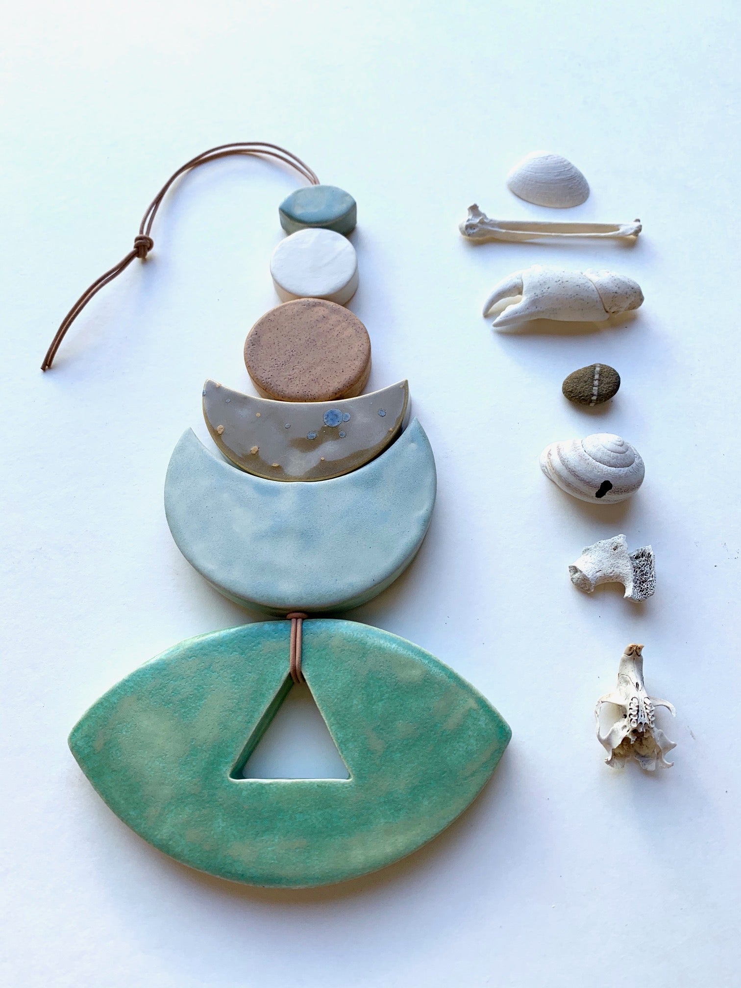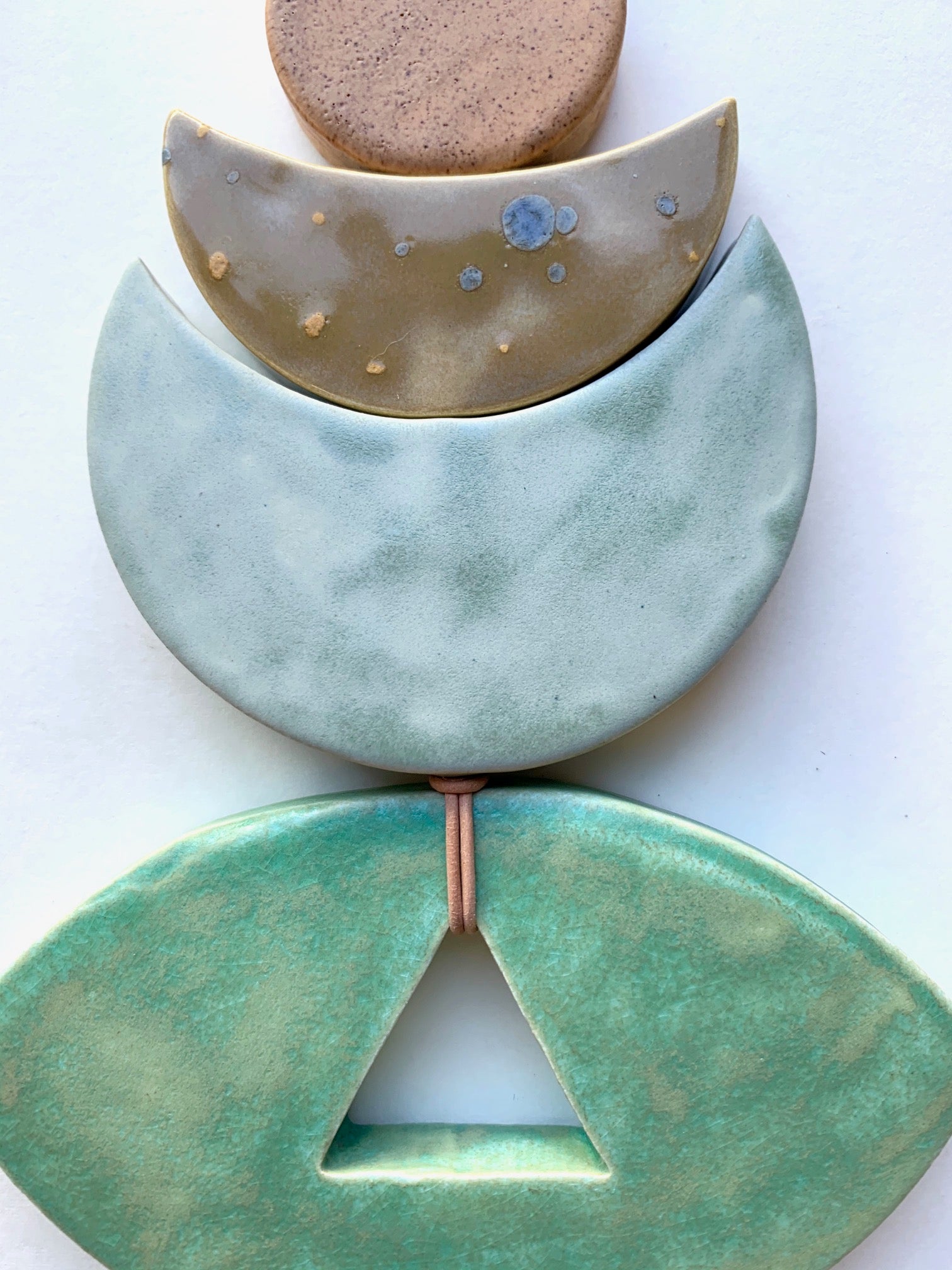 each & every piece of these wall hangings are designed, hand cut, cleaned, fired, cleaned again, glazed & fired for the second time, & sanded once more!   the moon & ocean pieces are all fairly chunky & glazed with beautiful, full range colors; some with crackles, some with speckles & all unique.  this piece is one of my largest yet; hanging 2.5 feet down.  this has been glazed with a burnished steel matte glaze & all of my glazes are non-toxic.
