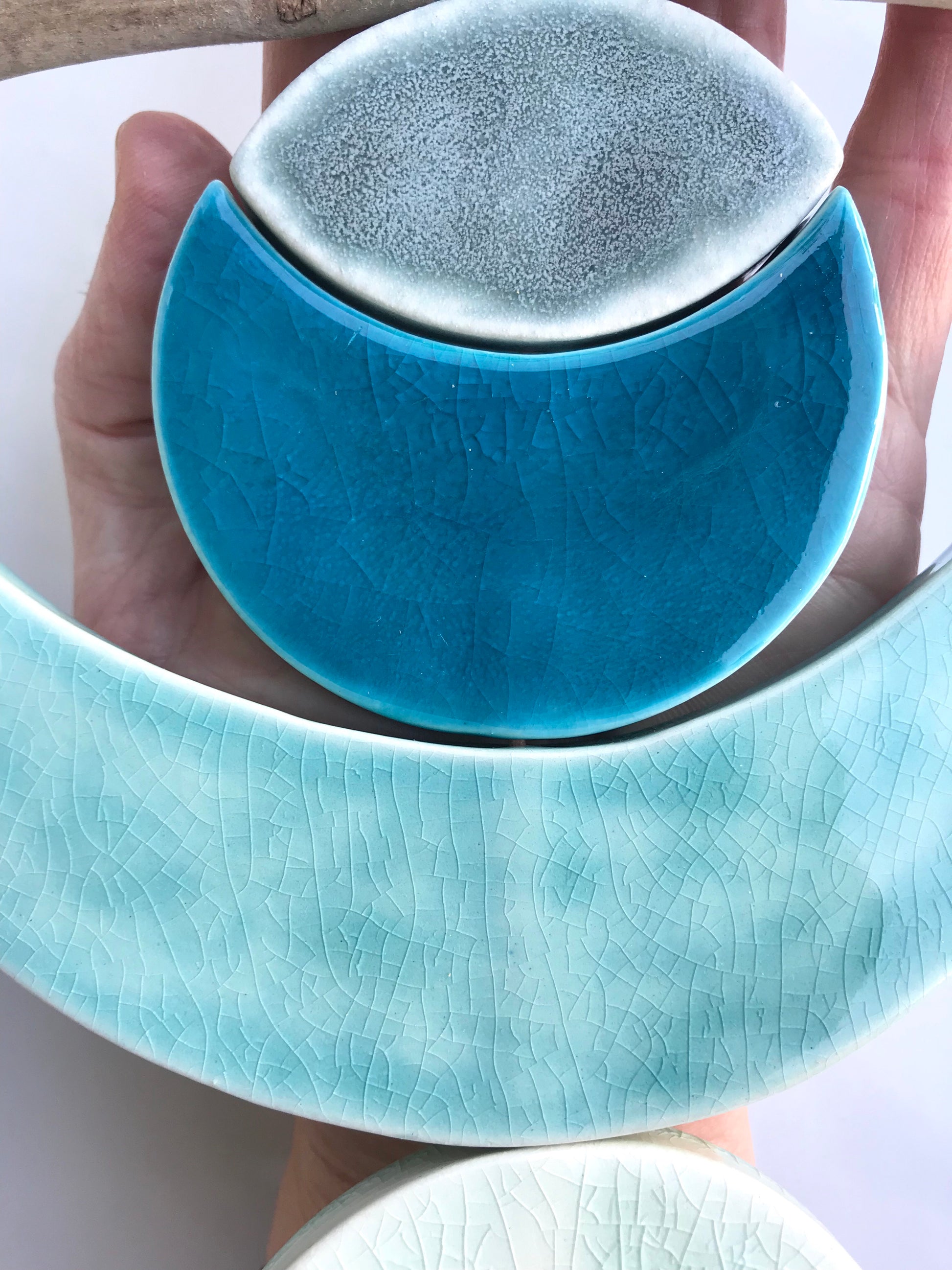 each & every piece of these wall hangings are designed, hand cut, cleaned, fired, cleaned again, glazed & fired for the second time, & sanded once more!   the moon & ocean pieces are all fairly chunky & glazed with beautiful, full range colors; some with crackles, some with speckles & all unique. they are strung on strong leather cord & come ready to hang. a piece of california beach driftwood (or several) has been attached. all of my glazes are non-toxic.
