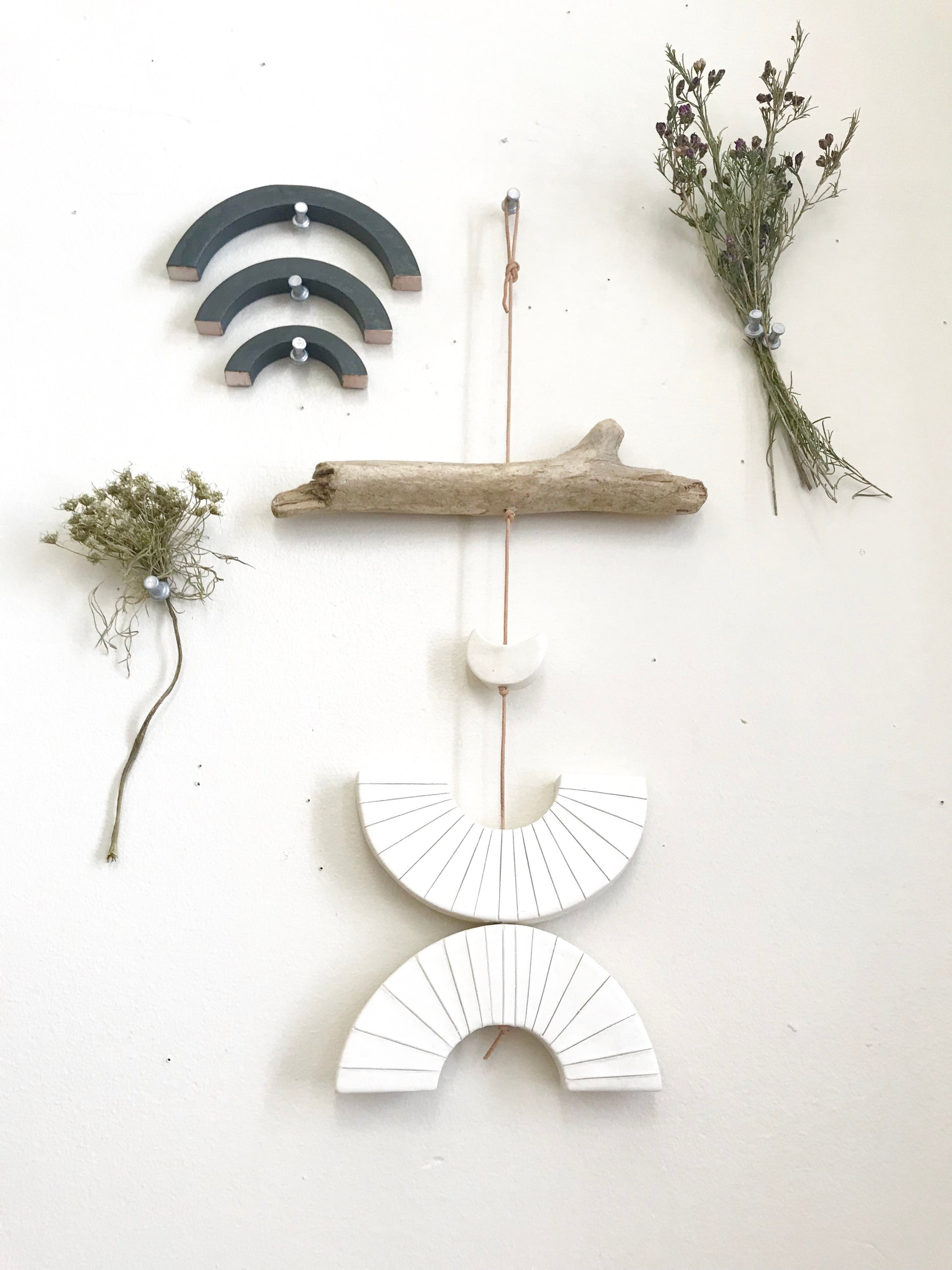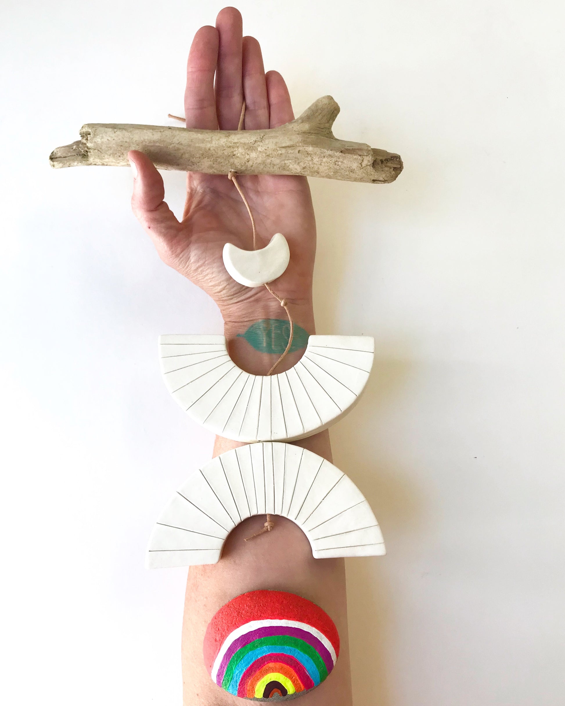 each & every piece of these wall hangings are cut, cleaned, fired twice, glazed by hand, designed & strung by me. the white pieces are all fairly chunky & feel so great to the touch with the minimal matte glaze. this piece is strung on strong leather cord & they all come ready to hang.  all of my glazes are non-toxic.