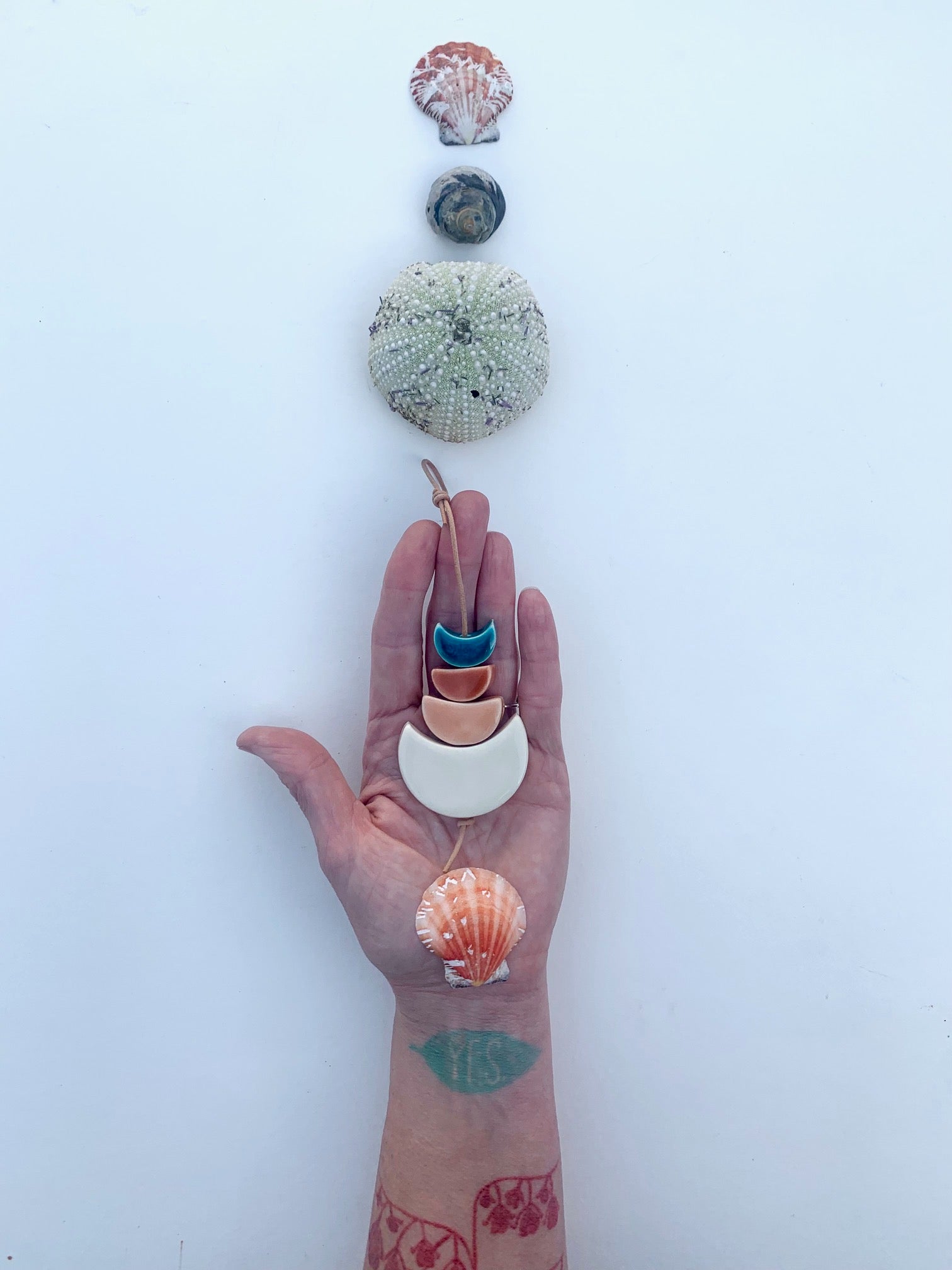 a lovely, chunky yet petite handmade ceramic wall hanging that is inspired by the bright beautiful white moonlight. this piece is strung on a soft tan goat skin leather cord & the ceramic pieces are designed, cut, cleaned, painted, glazed & fired twice by me.  each piece is handmade by me in my ceramic studio & i use only non-toxic, lead-free glazes.