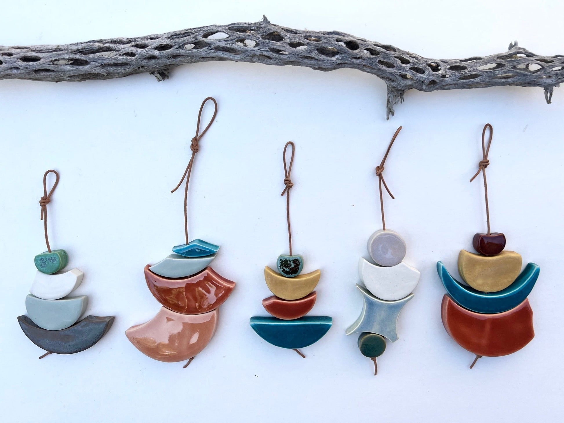 a lovely, chunky yet petite handmade ceramic wall hanging that is inspired by the sculptor barbara hepworth. this piece is strung on a soft tan goat skin leather cord & the ceramic pieces are designed, cut, cleaned, painted, glazed & fired twice by me.  each piece is handmade by me in my ceramic studio & i use only non-toxic, lead-free glazes.  barbara hepworth's use of shape & line is just brilliant; look her up if you are unfamiliar - her work is stellar.