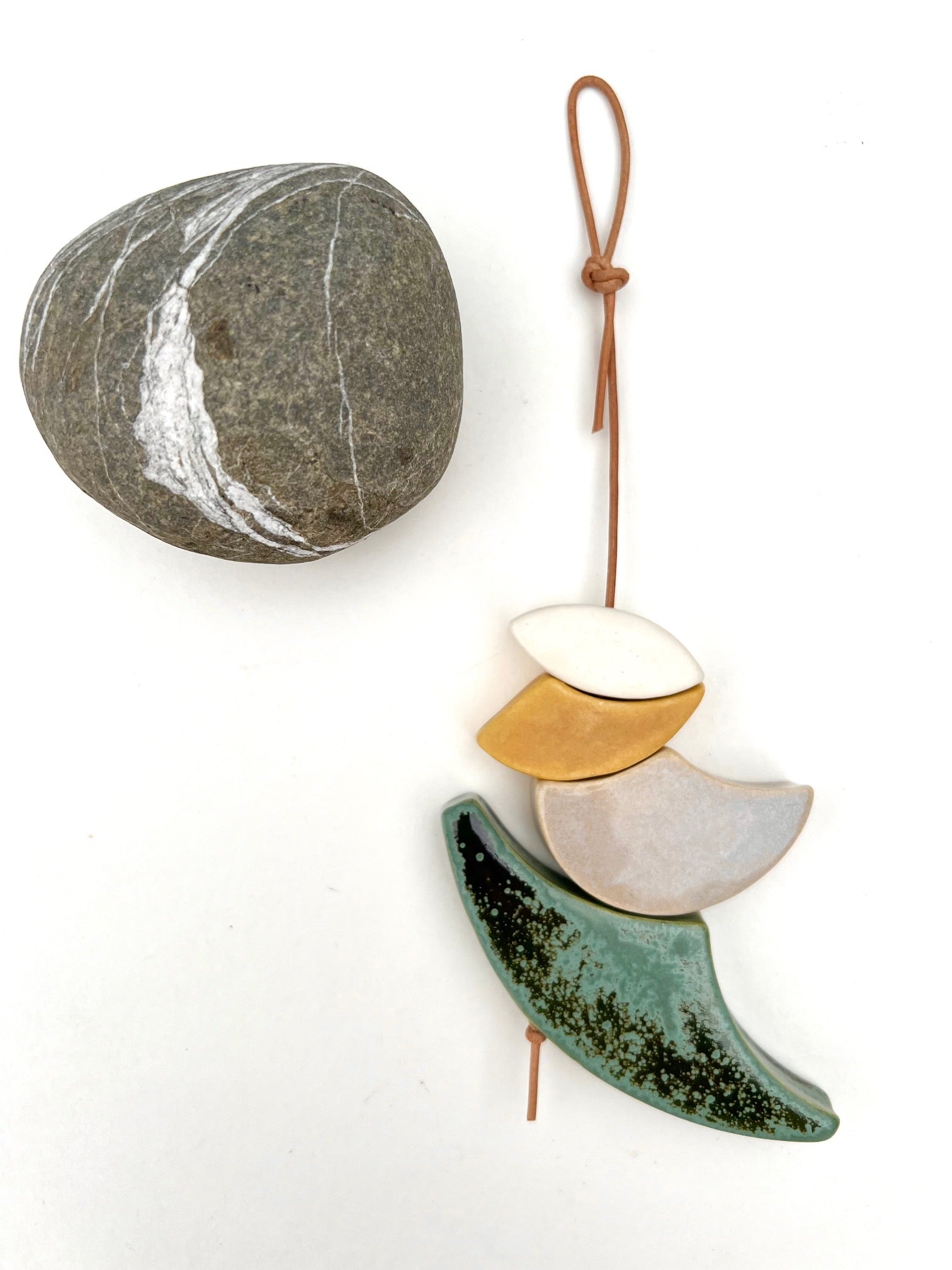 a lovely, chunky yet petite handmade ceramic wall hanging that is inspired by the sculptor barbara hepworth. this piece is strung on a soft tan leather cord & the ceramic pieces are designed, cut, cleaned, painted, glazed & fired twice by me.  each piece is handmade by me in my ceramic studio & i use only non-toxic, lead-free glazes.  barbara hepworth's use of shape & line is just brilliant; look her up if you are unfamiliar - her work is stellar.