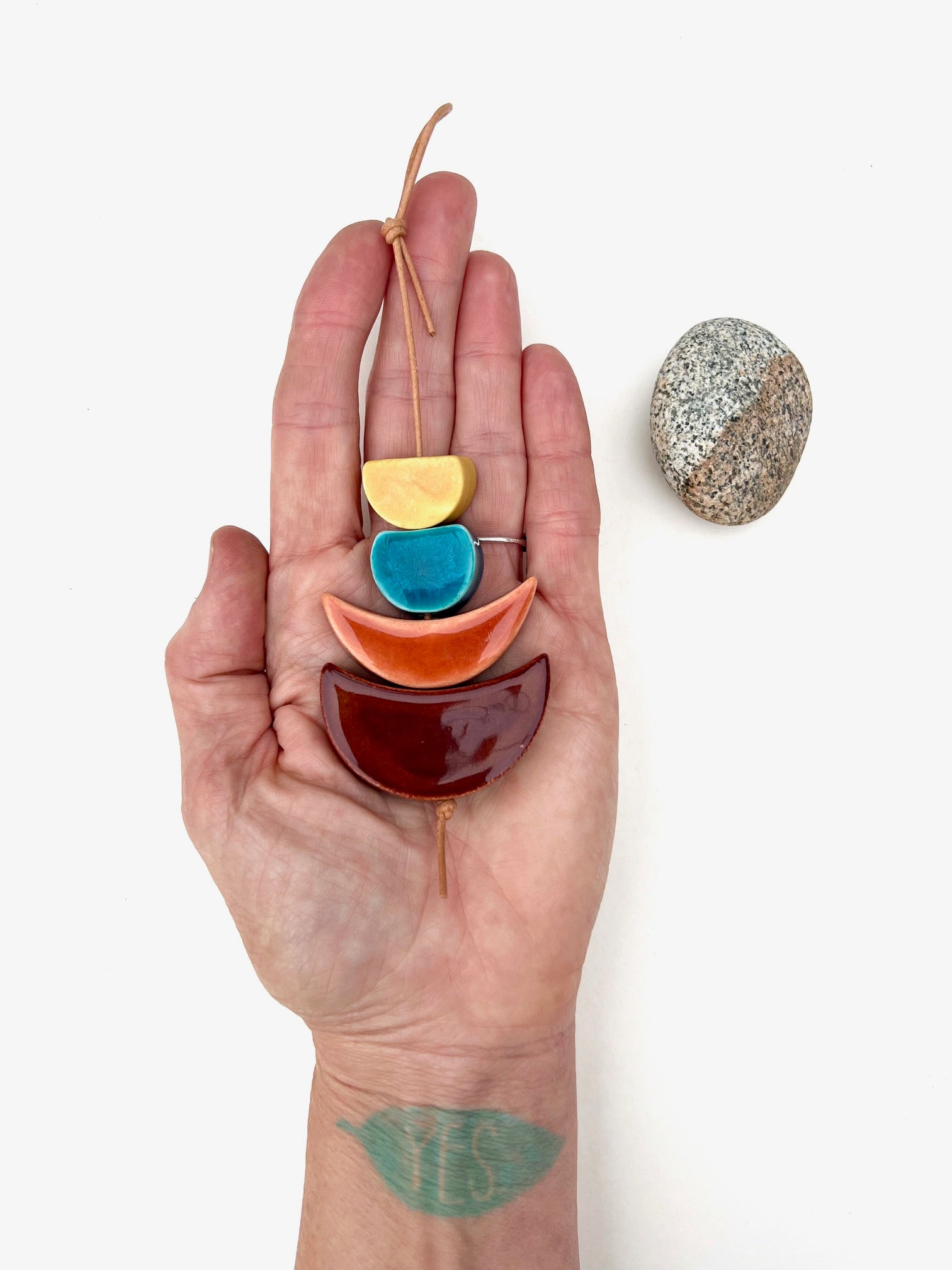 a lovely, chunky yet petite handmade ceramic wall hanging that is inspired by the sculptor barbara hepworth. this piece is strung on a soft tan leather cord & the ceramic pieces are designed, cut, cleaned, painted, glazed & fired twice by me.  each piece is handmade by me in my ceramic studio & i use only non-toxic, lead-free glazes.  barbara hepworth's use of shape & line is just brilliant; look her up if you are unfamiliar - her work is stellar.