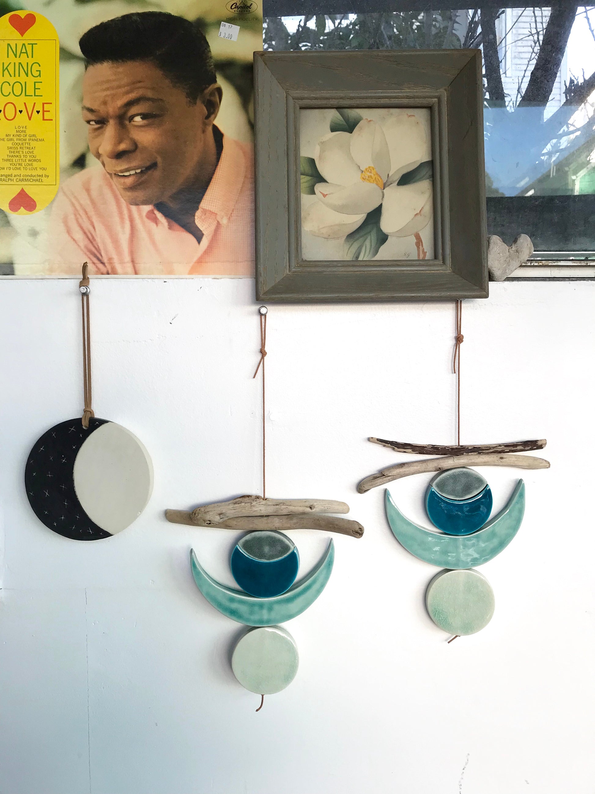 each & every piece of these wall hangings are designed, hand cut, cleaned, fired, cleaned again, glazed & fired for the second time, & sanded once more!   the moon & ocean pieces are all fairly chunky & glazed with beautiful, full range colors; some with crackles, some with speckles & all unique. they are strung on strong leather cord & come ready to hang. a piece of california beach driftwood (or several) has been attached. all of my glazes are non-toxic.