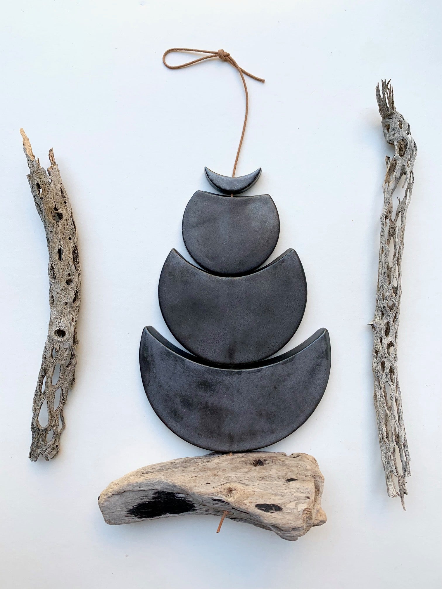 each & every piece of these wall hangings are designed, hand cut, cleaned, fired, cleaned again, glazed & fired for the second time, & sanded once more! the moon & ocean pieces are all fairly chunky & glazed with beautiful, full range colors; some with crackles, some with speckles & all unique. they are strung on strong leather cord & come ready to hang. some pieces have california driftwood attached as well. all of my glazes are non-toxic.
