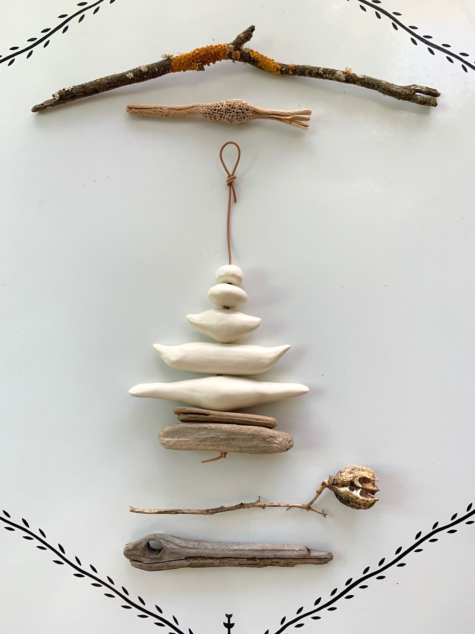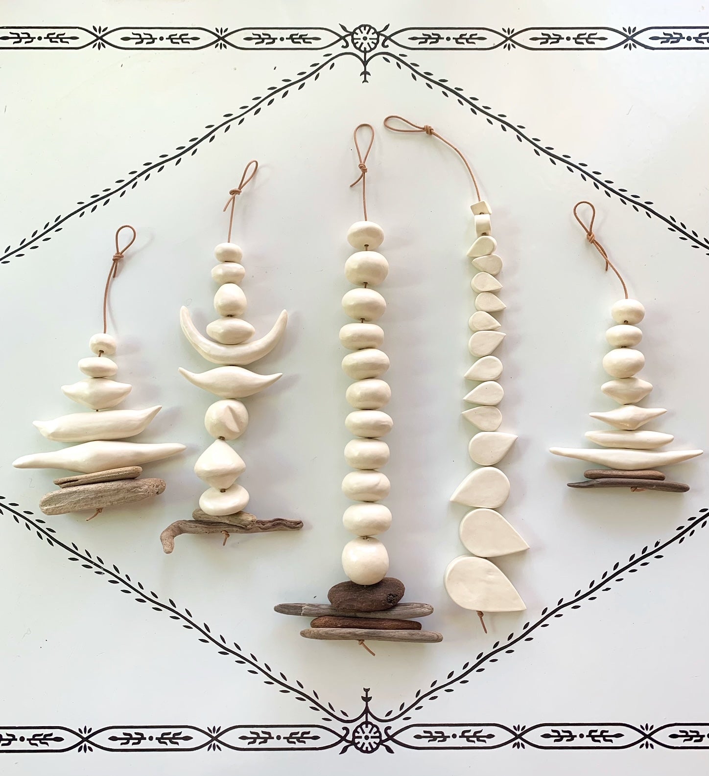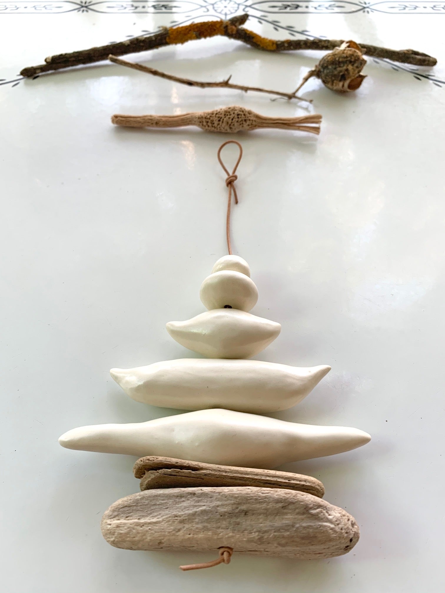 each & every piece of these wall hangings are hand formed, cleaned, sanded, designed, fired twice, & glazed by hand. these are strung on strong leather cord & come ready to hang. these pieces range in length from 8-36". all of my glazes are non-toxic. some pieces have collected california beach driftwood added as well.