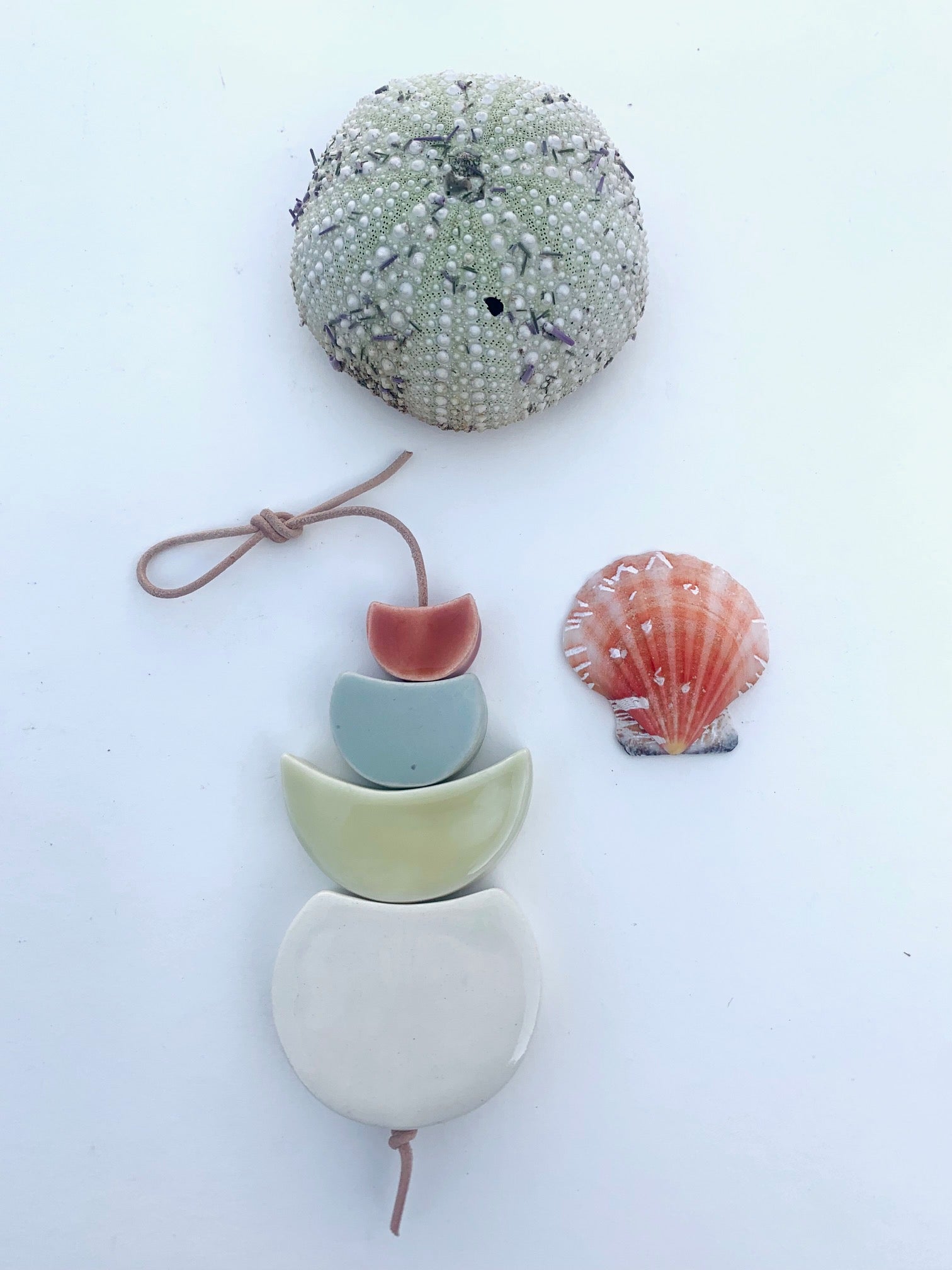 a lovely, chunky yet petite handmade ceramic wall hanging that is inspired by the bright beautiful white moonlight. this piece is strung on a soft tan goat skin leather cord & the ceramic pieces are designed, cut, cleaned, painted, glazed & fired twice by me.  each piece is handmade by me in my ceramic studio & i use only non-toxic, lead-free glazes.
