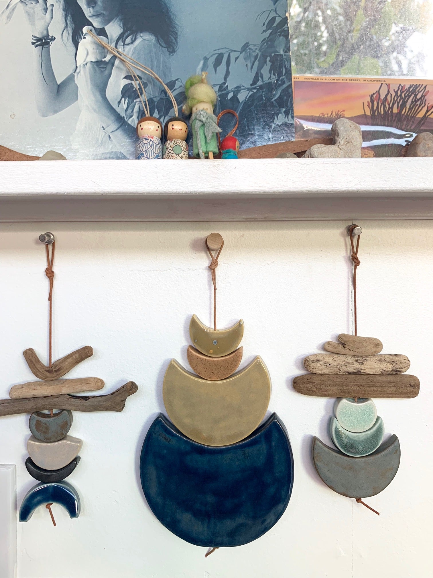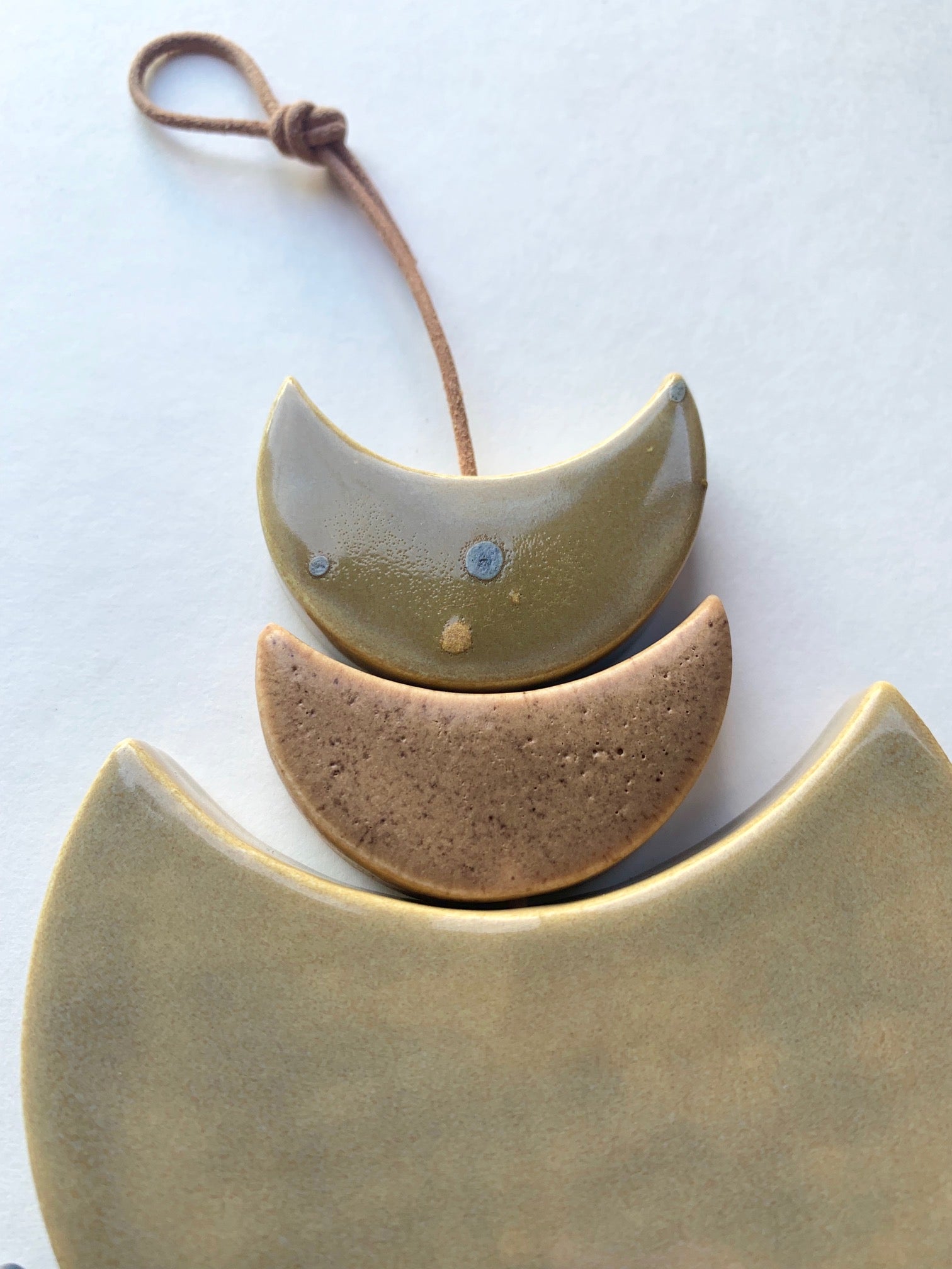 these pieces are from a series for a collaboration show i did called ‘symbiotic’ whereby my artist friend, rachel t robertson, & i worked together for almost a year to make pieces together & separate.  each & every piece of these wall hangings are cut, cleaned, sanded, fired twice, designed & strung by me. the pieces are all fairly chunky & come in a lovely combination of specific color ways we chose for the show we did together.  they are strung on strong lovely natural leather cord & come ready to hang. each piece includes a custom made wooden dowel peg for the piece to hang on.  these pieces hang between approximately 8-20 inches straight down. all of my clay & glazes are non-toxic.