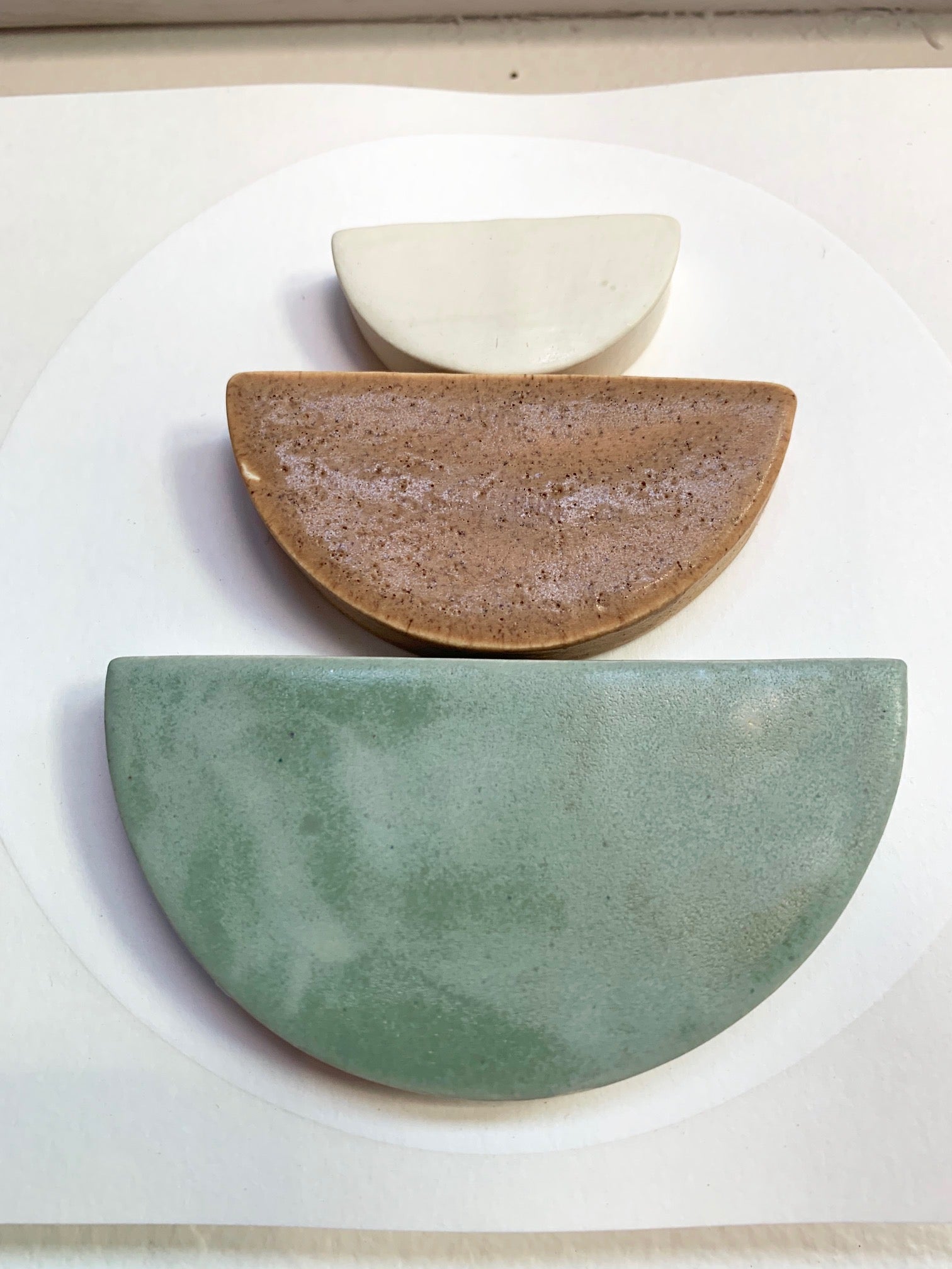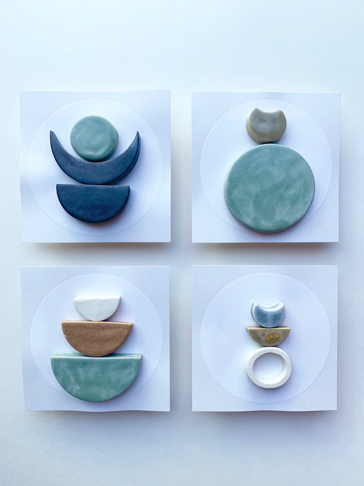 these pieces are from a series for a collaboration show i did called ‘symbiotic’ whereby my artist friend, rachel t robertson, & i worked together for almost a year to make pieces together & separate.  the ceramic pieces have each been cut, cleaned, sanded, fired twice, designed & affixed by me on to beautiful watercolor paper from a case for making in san francisco.  the special emobossed watercolor paper has been mounted to a wooden square panel that sits off the wall about 3/4 of an inch.   the pieces are all fairly chunky & come in a lovely combination of specific colorways we chose for the show we did together.  all of my clay & glazes are non-toxic.