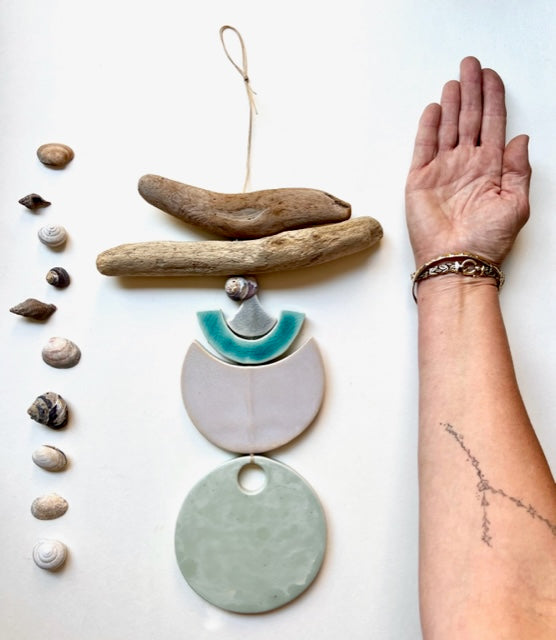 each & every piece of these wall hangings are cut, cleaned, sanded, designed, fired twice, & glazed by hand. the moon, desert & sea pieces are all fairly chunky & glazed with beautiful, full range colors; some with crackles, some with speckles & all unique. this piece is strung on waxed linen cord & it comes ready to hang.  these pieces range in length from 8-24".  all of my glazes are non-toxic. some ocean pieces have collected california beach driftwood added as well.  this particular piece has a sweet little beach shell as well.