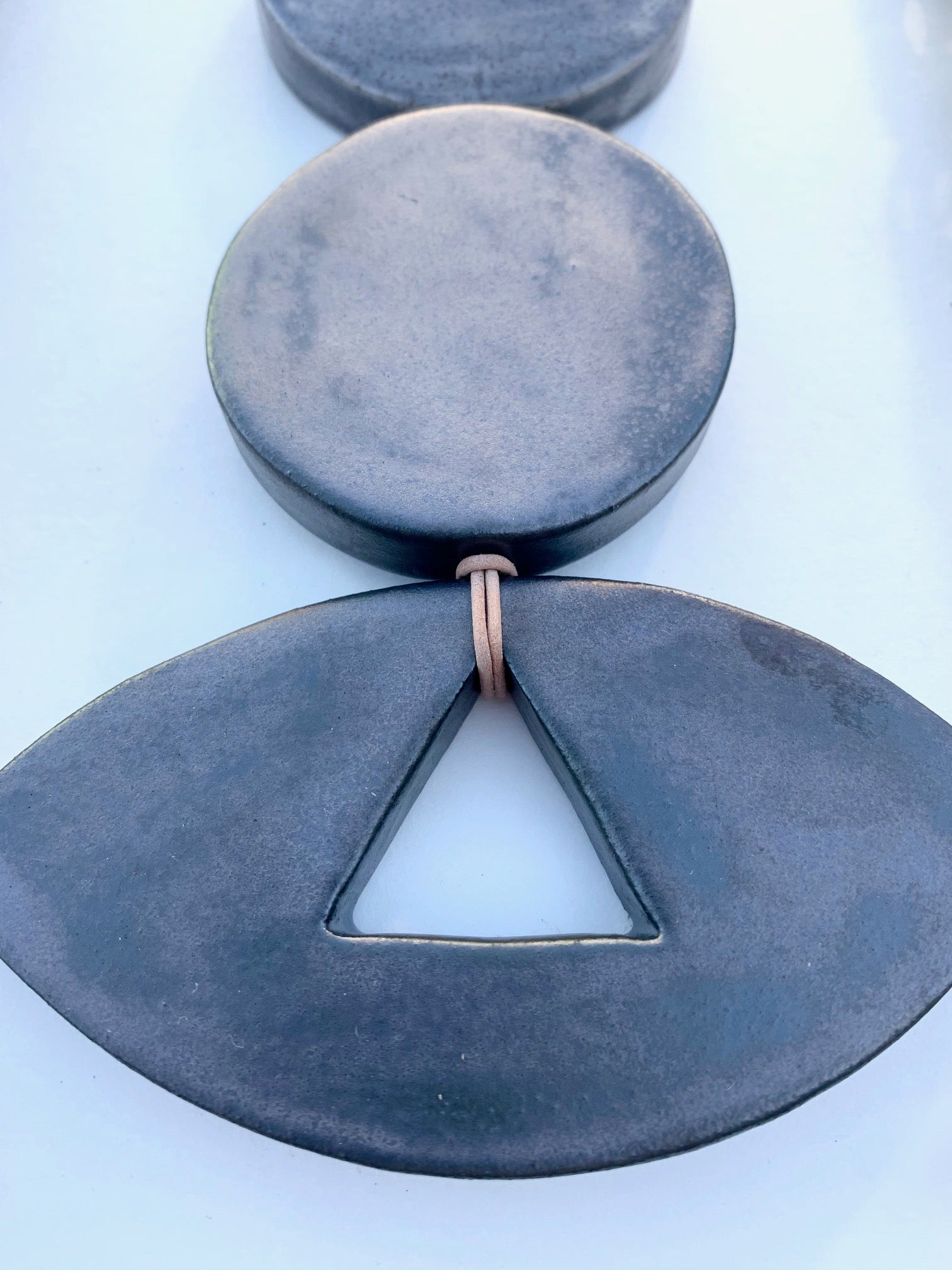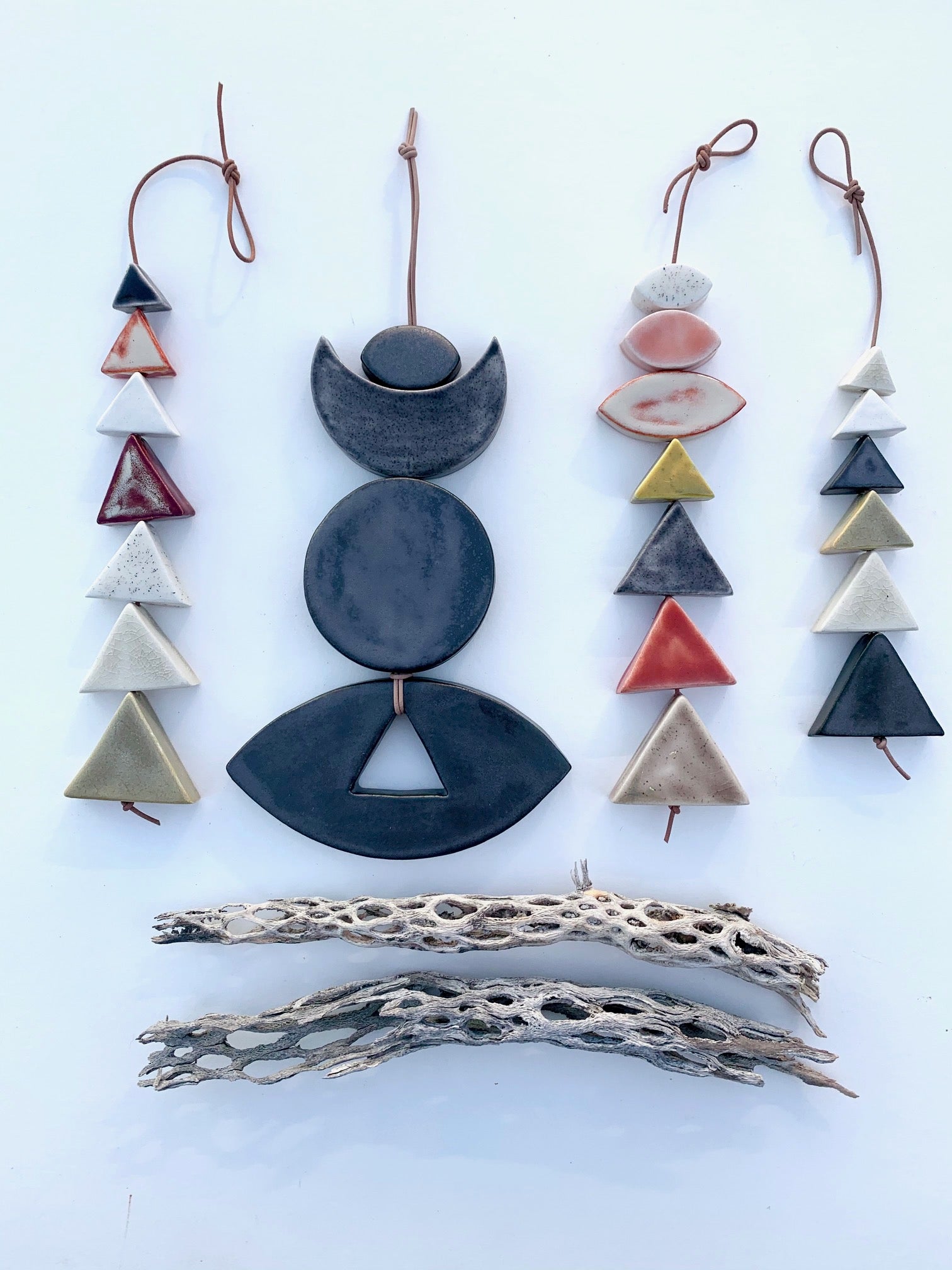 each & every piece of these desert wall hangings are cut, cleaned, fired twice, glazed by hand, designed & strung by me. the desert pieces are all fairly chunky & glazed with beautiful, full range colors; some with crackles, some with speckles & all unique. i color swatched a lot of the flora on my most recent trip to the desert & matched up some favorite glazes for this series. they are strung on strong lovely natural leather cord & come ready to hang. these pieces hang between approximately 10-18 inches straight down. all of my glazes are non-toxic.