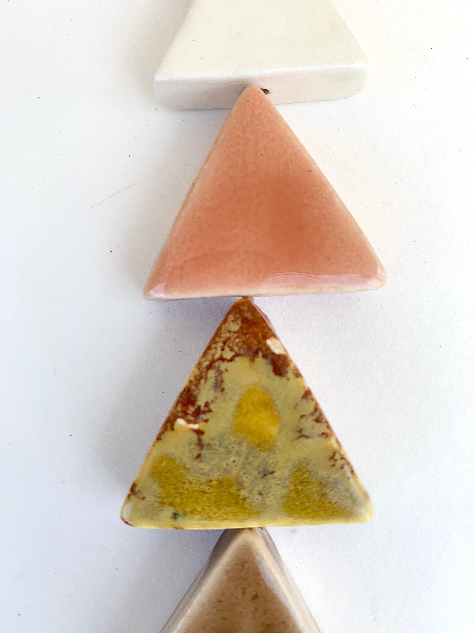 each & every piece of these desert wall hangings are cut, cleaned, fired twice, glazed by hand, designed & strung by me. the desert pieces are all fairly chunky & glazed with beautiful, full range colors; some with crackles, some with speckles & all unique. i color swatched a lot of the flora on my most recent trip to the desert & matched up some favorite glazes for this series. they are strung on strong lovely natural leather cord & come ready to hang. these pieces hang between approximately 10-18 inches straight down. all of my glazes are non-toxic.