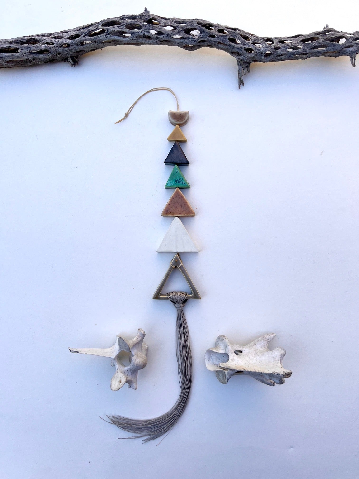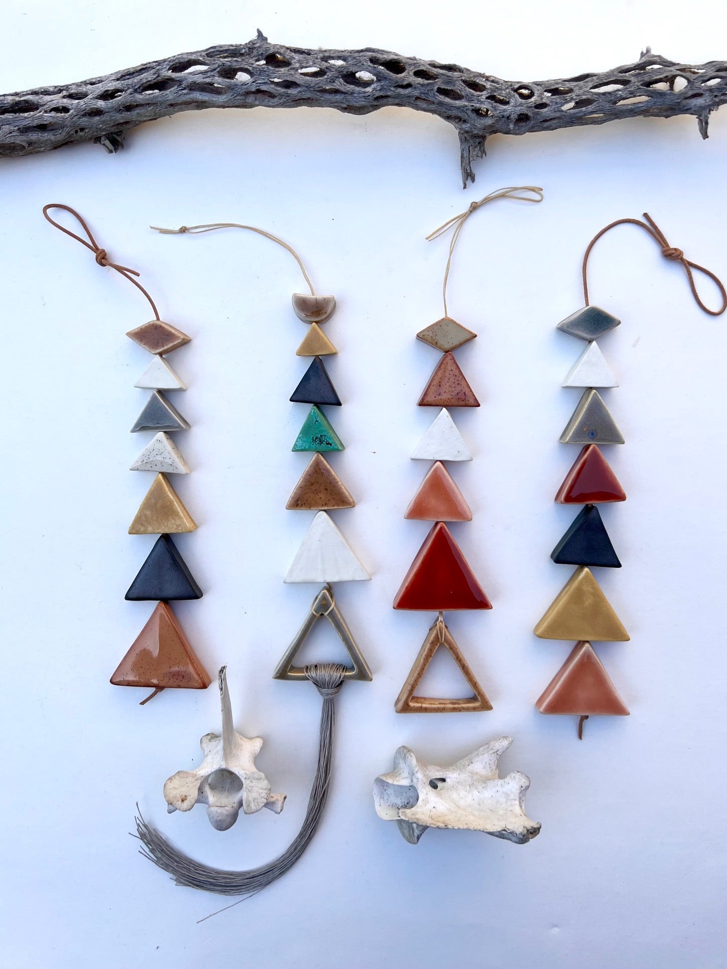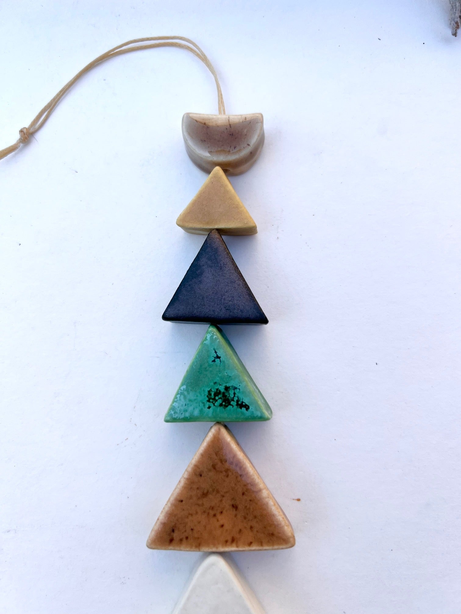 each & every piece of these desert wall hangings are cut, cleaned, fired twice, glazed by hand, designed & strung by me. the desert pieces are all fairly chunky & glazed with beautiful, full range colors; some with crackles, some with speckles & all unique. i color swatched a lot of the flora on my most recent trip to the desert & matched up some favorite glazes for this series. they are strung on strong lovely natural waxed linen cord & come ready to hang. these pieces hang between approximately 10-18 inches straight down. this particular piece has an addition of linen fibers added at the bottom. all of my glazes are non-toxic.