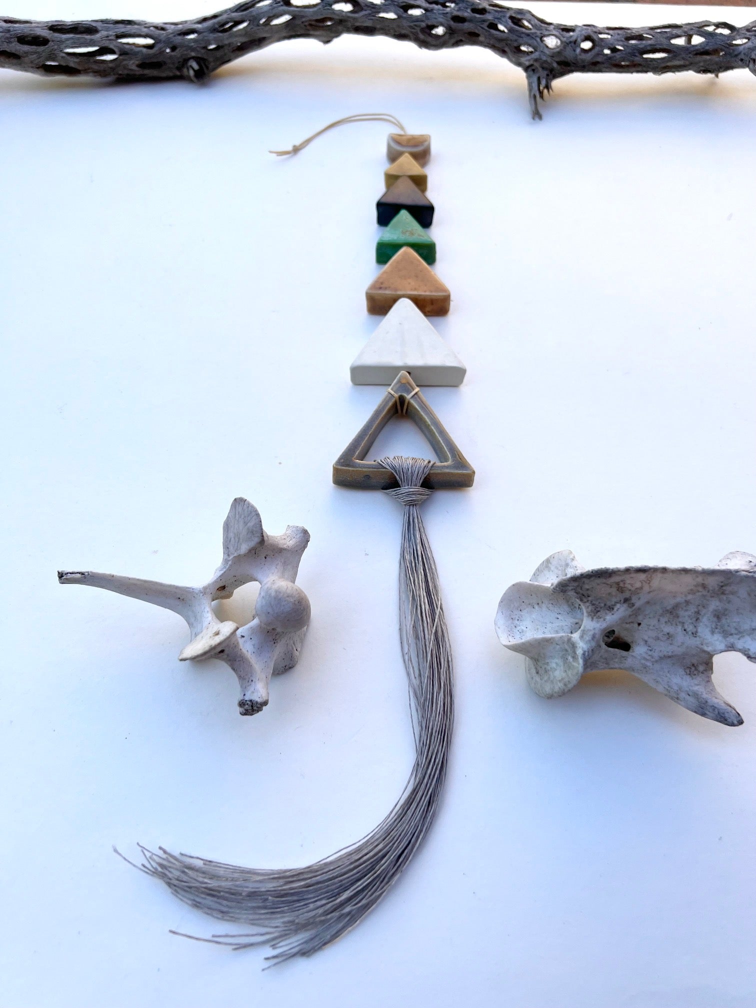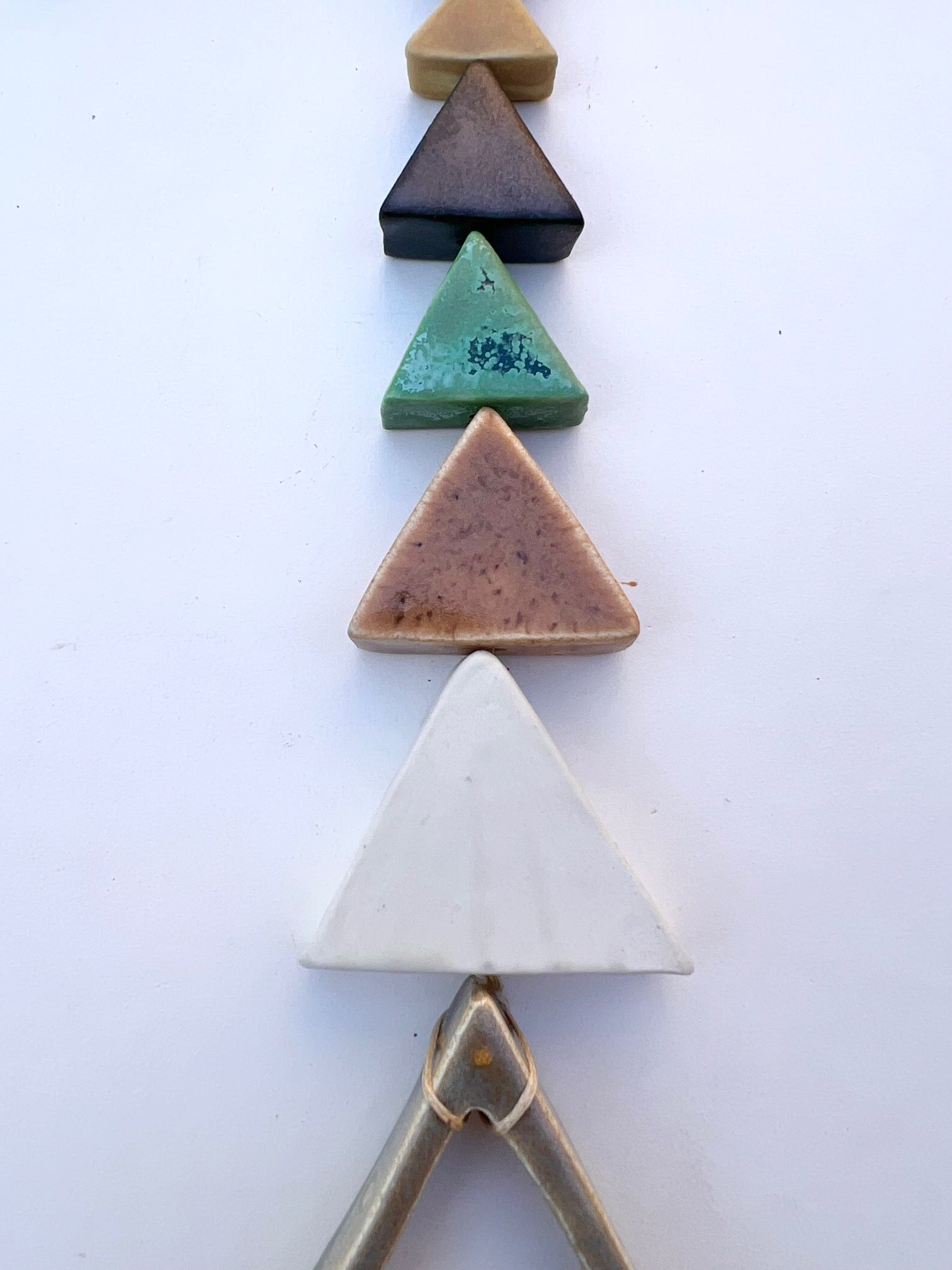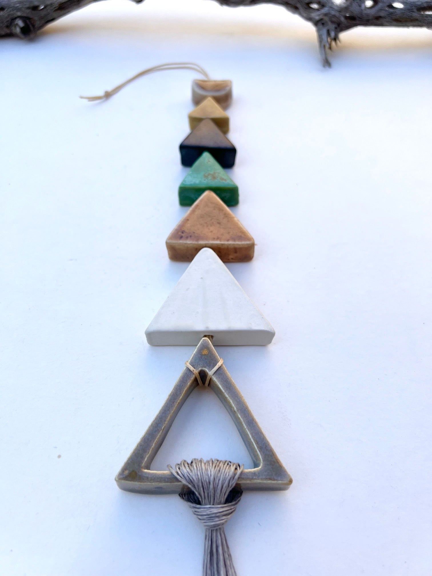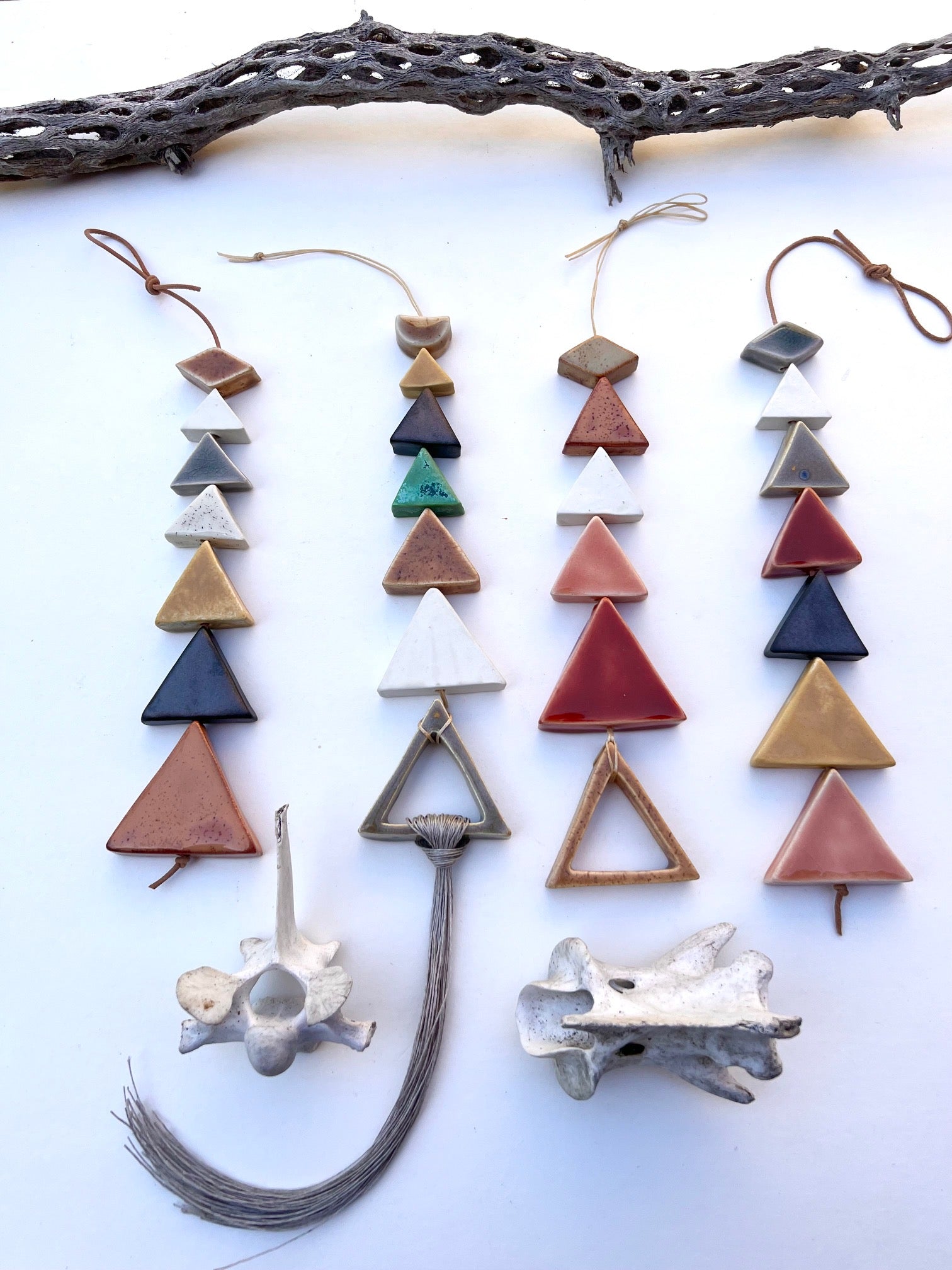 each & every piece of these desert wall hangings are cut, cleaned, fired twice, glazed by hand, designed & strung by me. the desert pieces are all fairly chunky & glazed with beautiful, full range colors; some with crackles, some with speckles & all unique. i color swatched a lot of the flora on my most recent trip to the desert & matched up some favorite glazes for this series. they are strung on strong lovely natural waxed linen cord & come ready to hang. these pieces hang between approximately 10-18 inches straight down. this particular piece has an addition of linen fibers added at the bottom. all of my glazes are non-toxic.