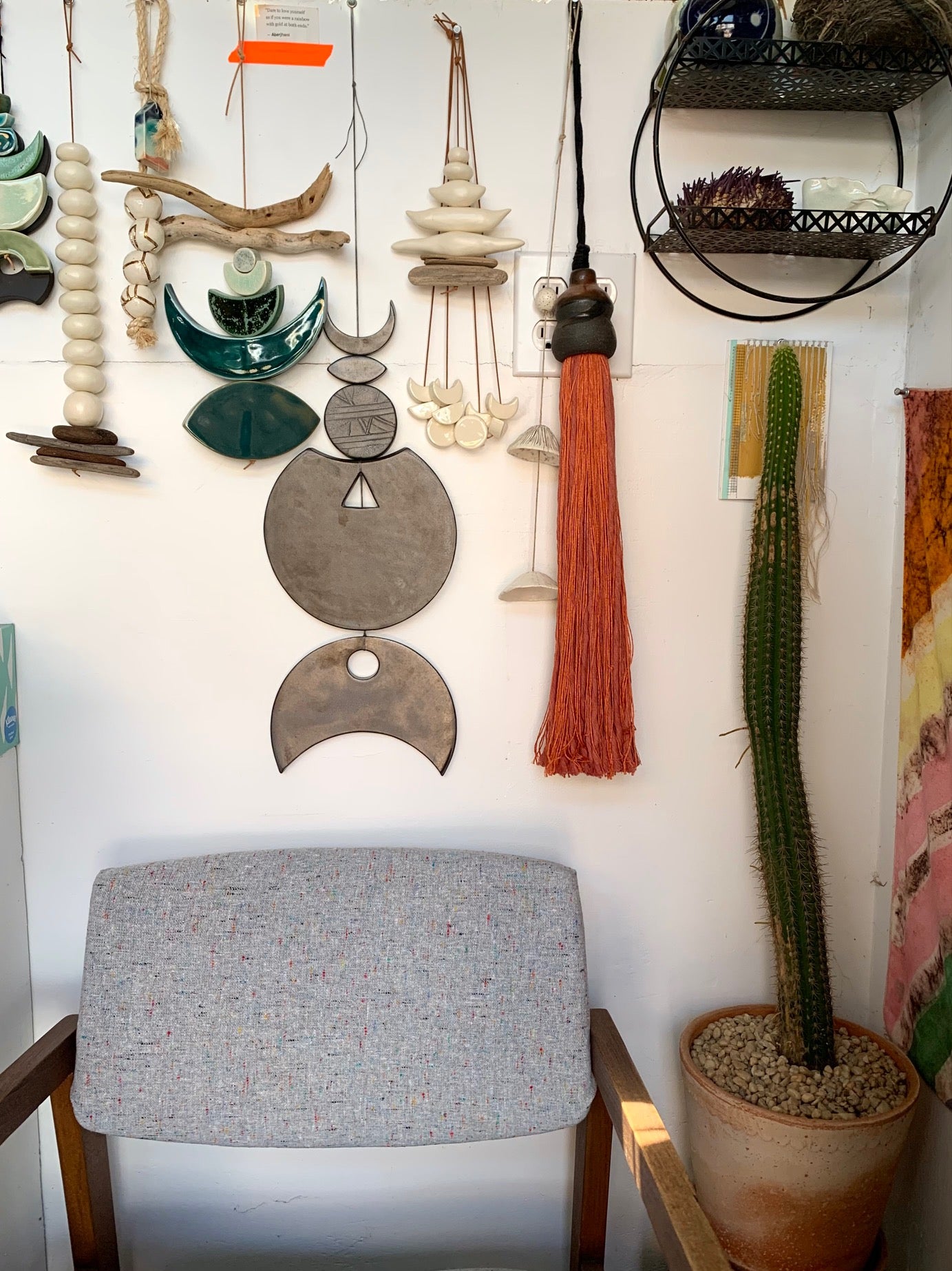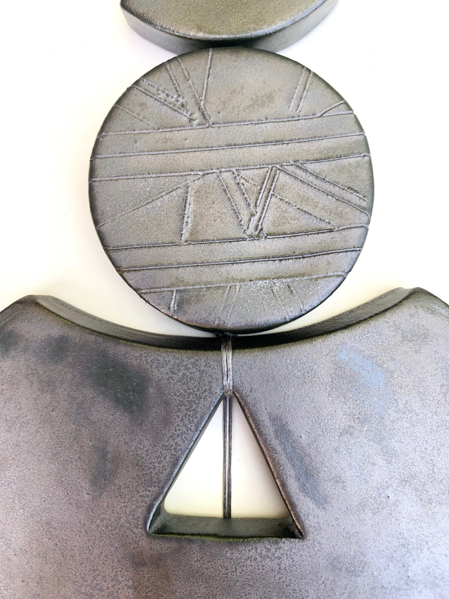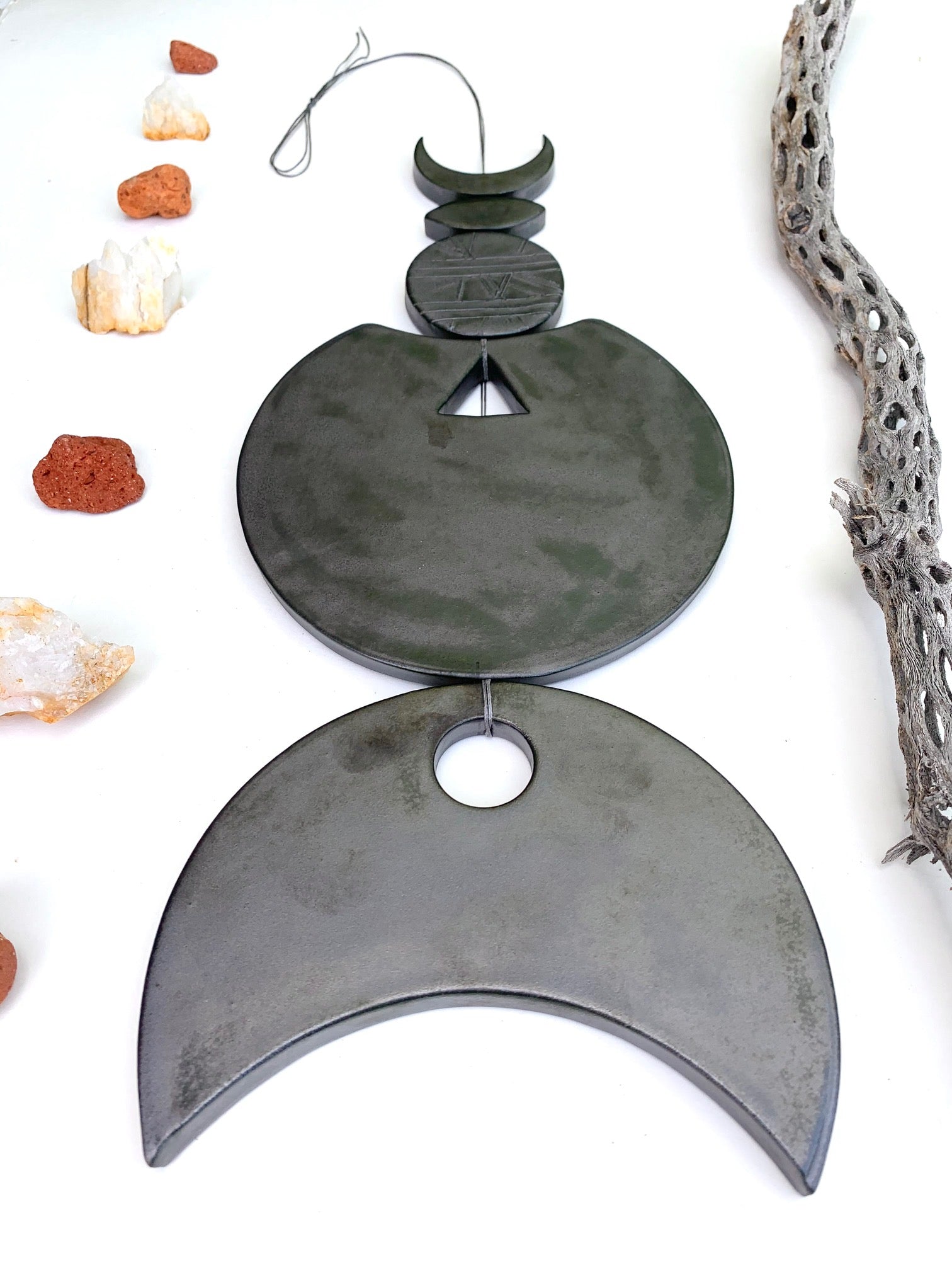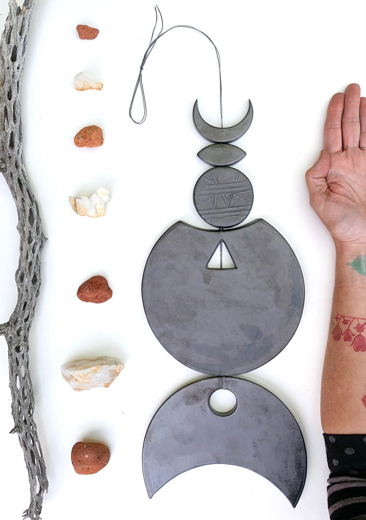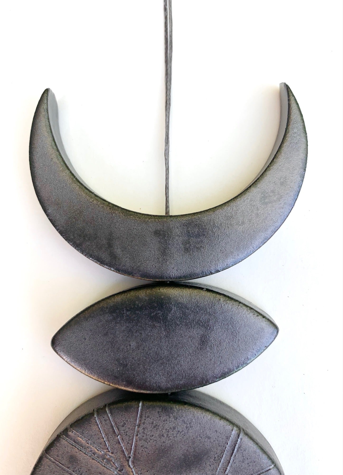 each & every piece of these wall hangings are designed, hand cut, cleaned, fired, cleaned again, glazed & fired for the second time, & sanded once more!   the moon & ocean pieces are all fairly chunky & glazed with beautiful, full range colors; some with crackles, some with speckles & all unique.  this piece is one of my largest yet; hanging 2.5 feet down on waxed linen.  this has been glazed with a burnished steel matte glaze & all of my glazes are non-toxic.