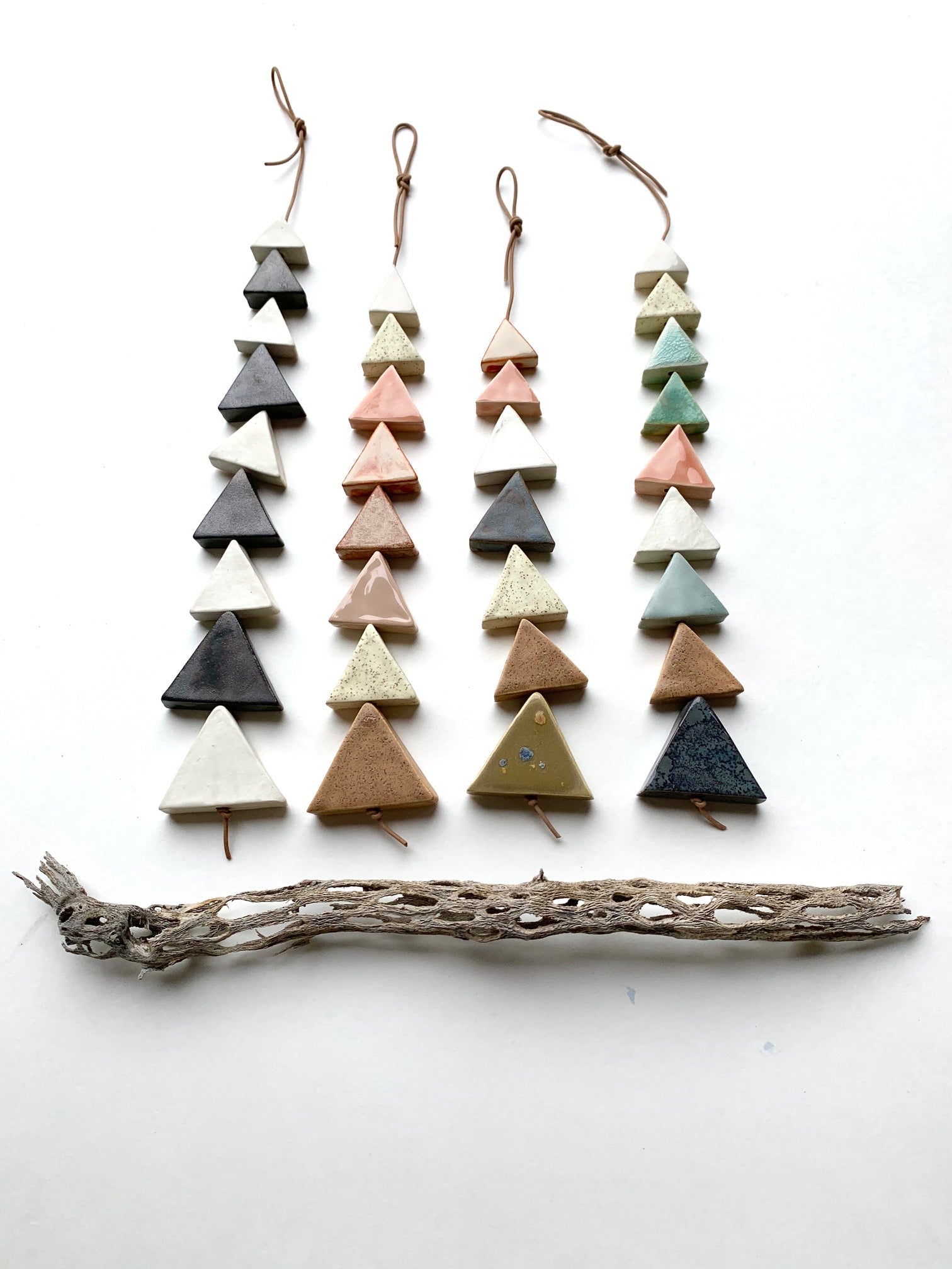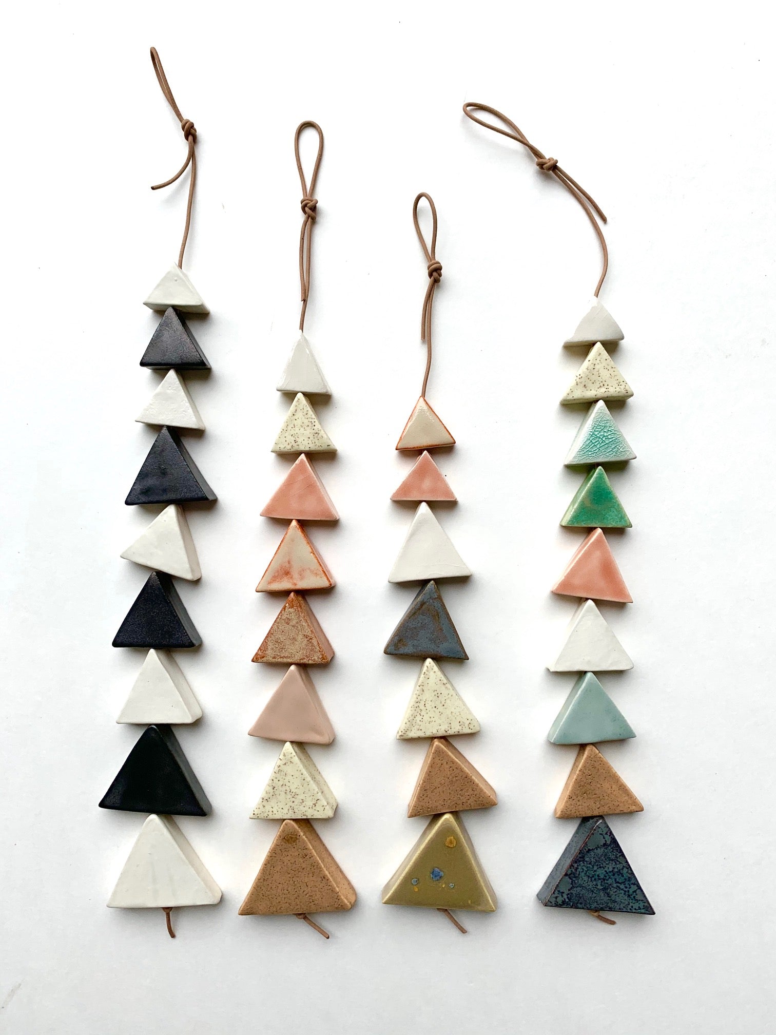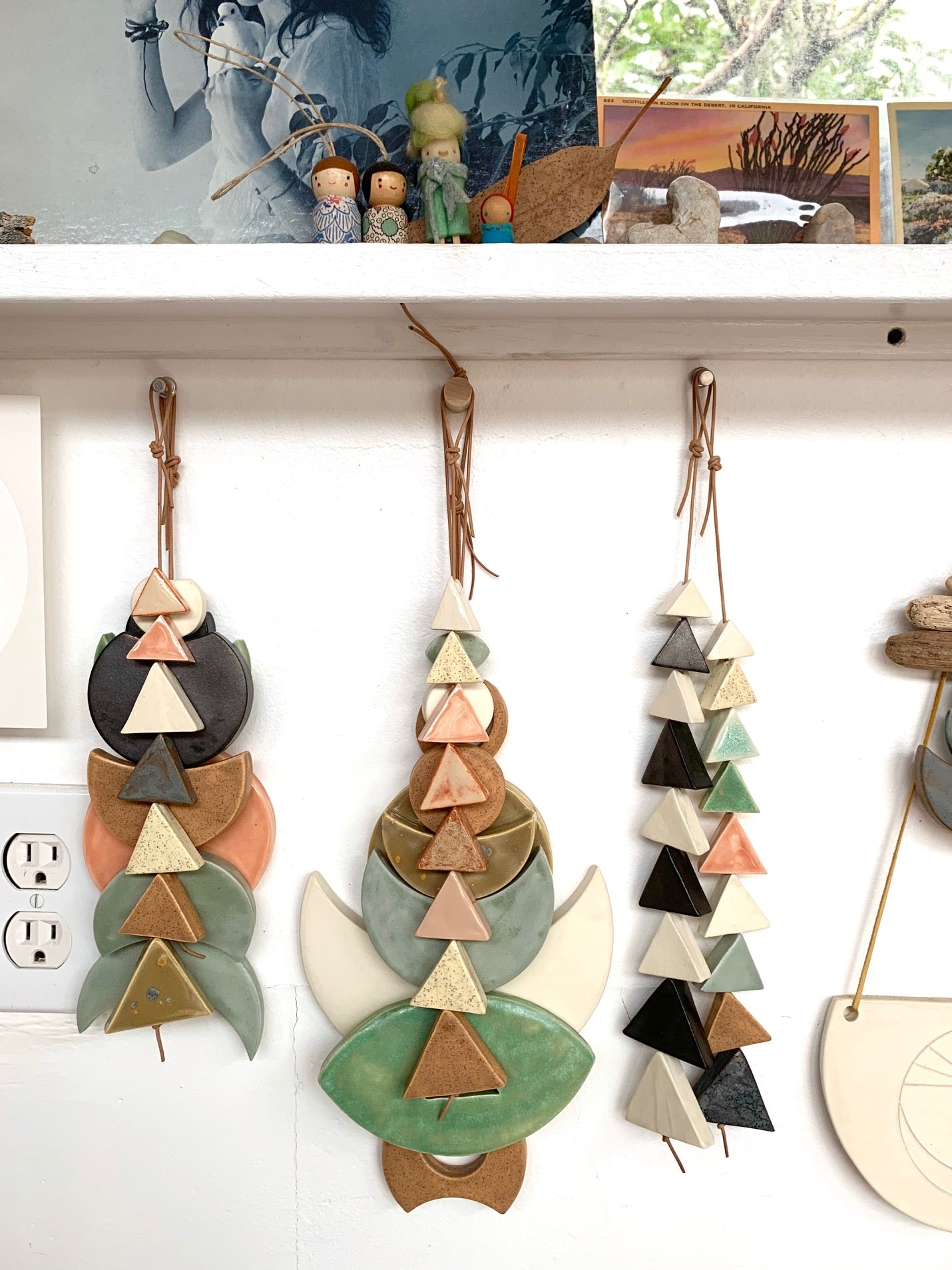 each & every piece of these desert wall hangings are cut, cleaned, fired twice, glazed by hand, designed & strung by me. the desert pieces are all fairly chunky & glazed with beautiful, full range colors; some with crackles, some with speckles & all unique. i color swatched a lot of the flora on my most recent trip to the desert & matched up some favorite glazes for this series. they are strung on strong lovely natural leather cord & come ready to hang. these pieces hang between approximately 10-18 inches straight down. all of my glazes are non-toxic.