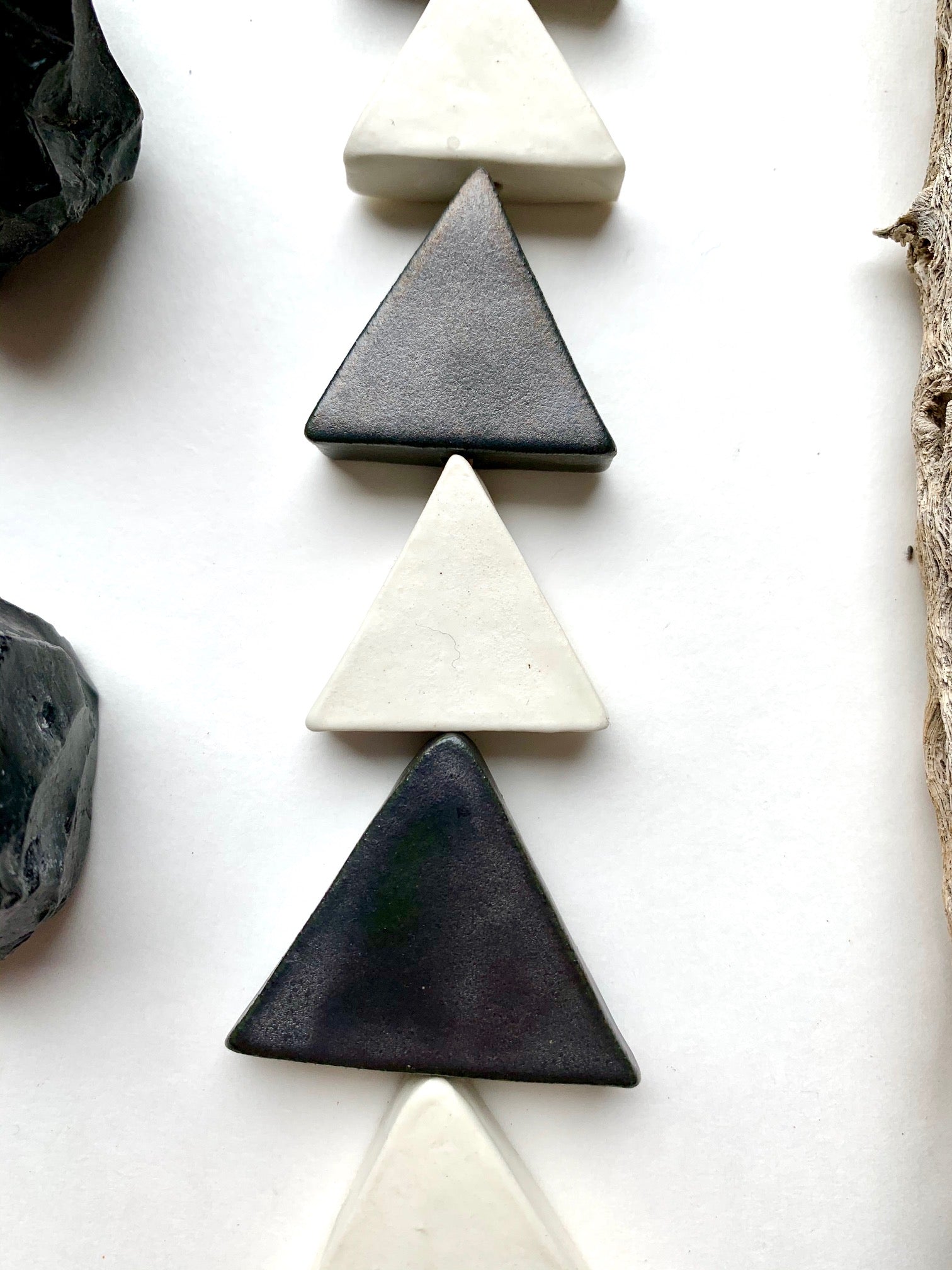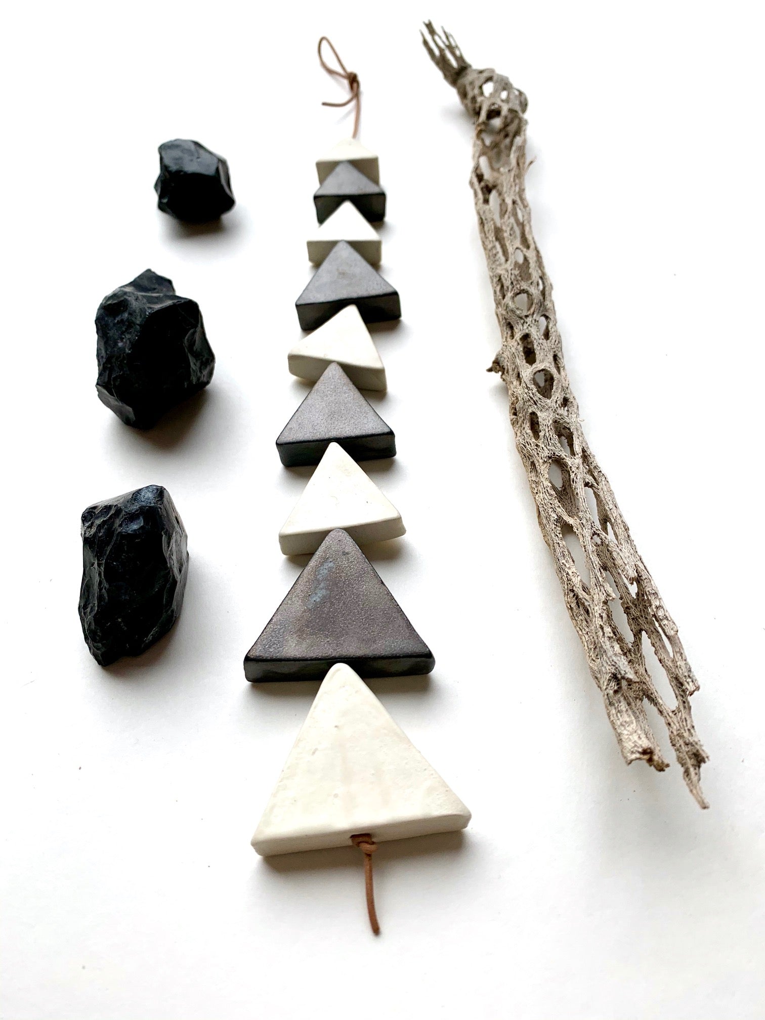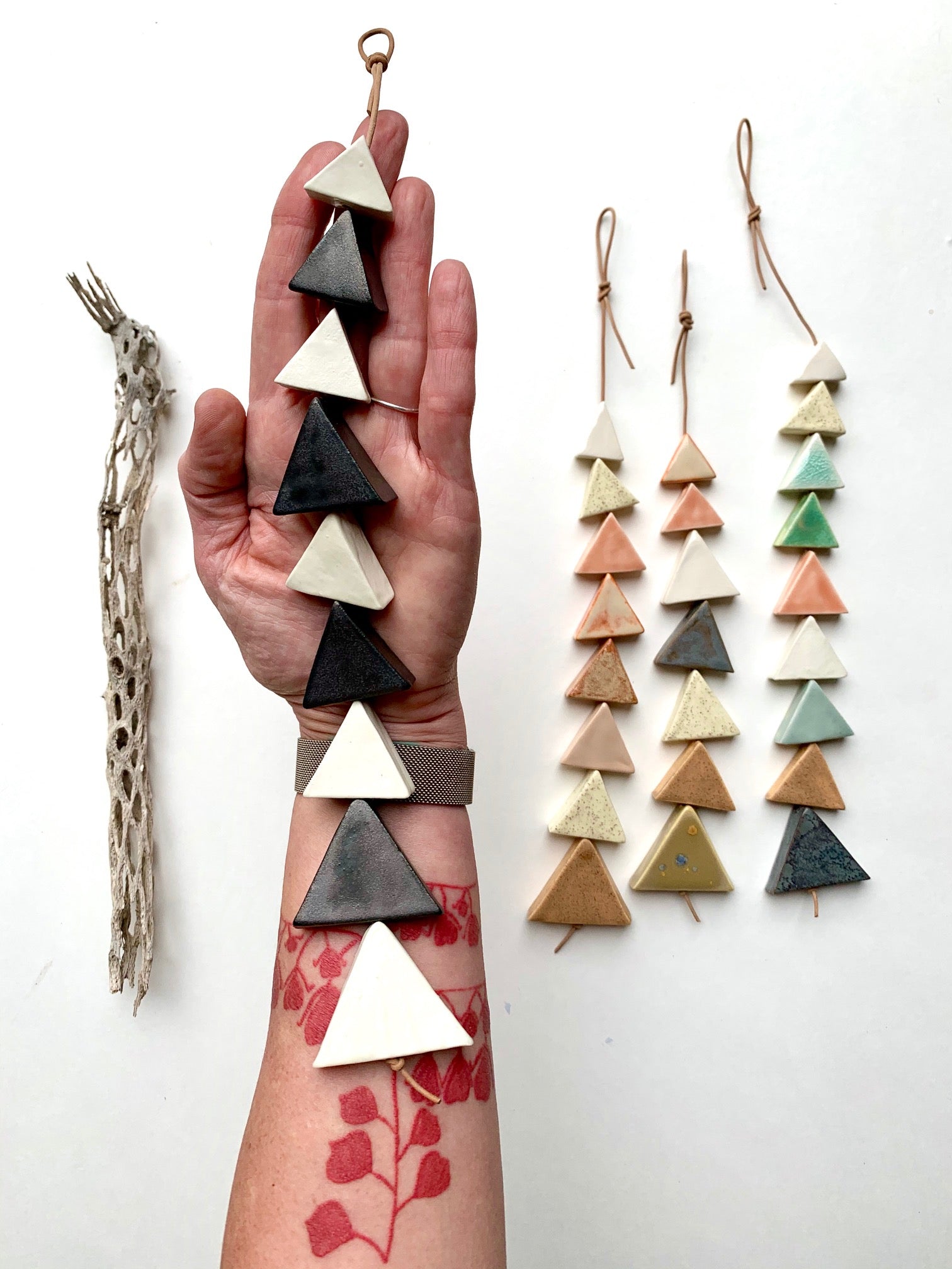 each & every piece of these desert wall hangings are cut, cleaned, fired twice, glazed by hand, designed & strung by me. the desert pieces are all fairly chunky & glazed with beautiful, full range colors; some with crackles, some with speckles & all unique. i color swatched a lot of the flora on my most recent trip to the desert & matched up some favorite glazes for this series. they are strung on strong lovely natural leather cord & come ready to hang. these pieces hang between approximately 10-18 inches straight down. all of my glazes are non-toxic.