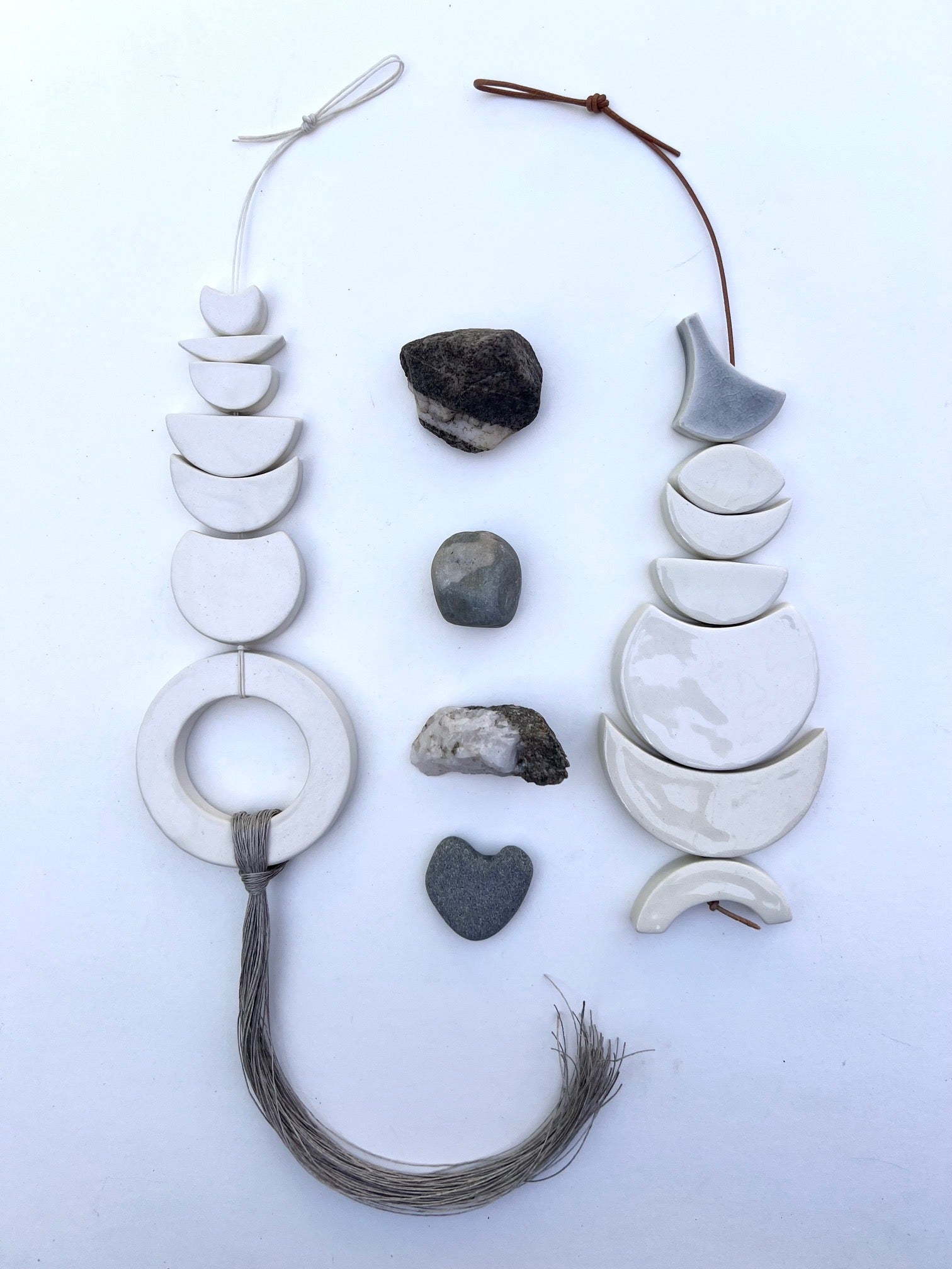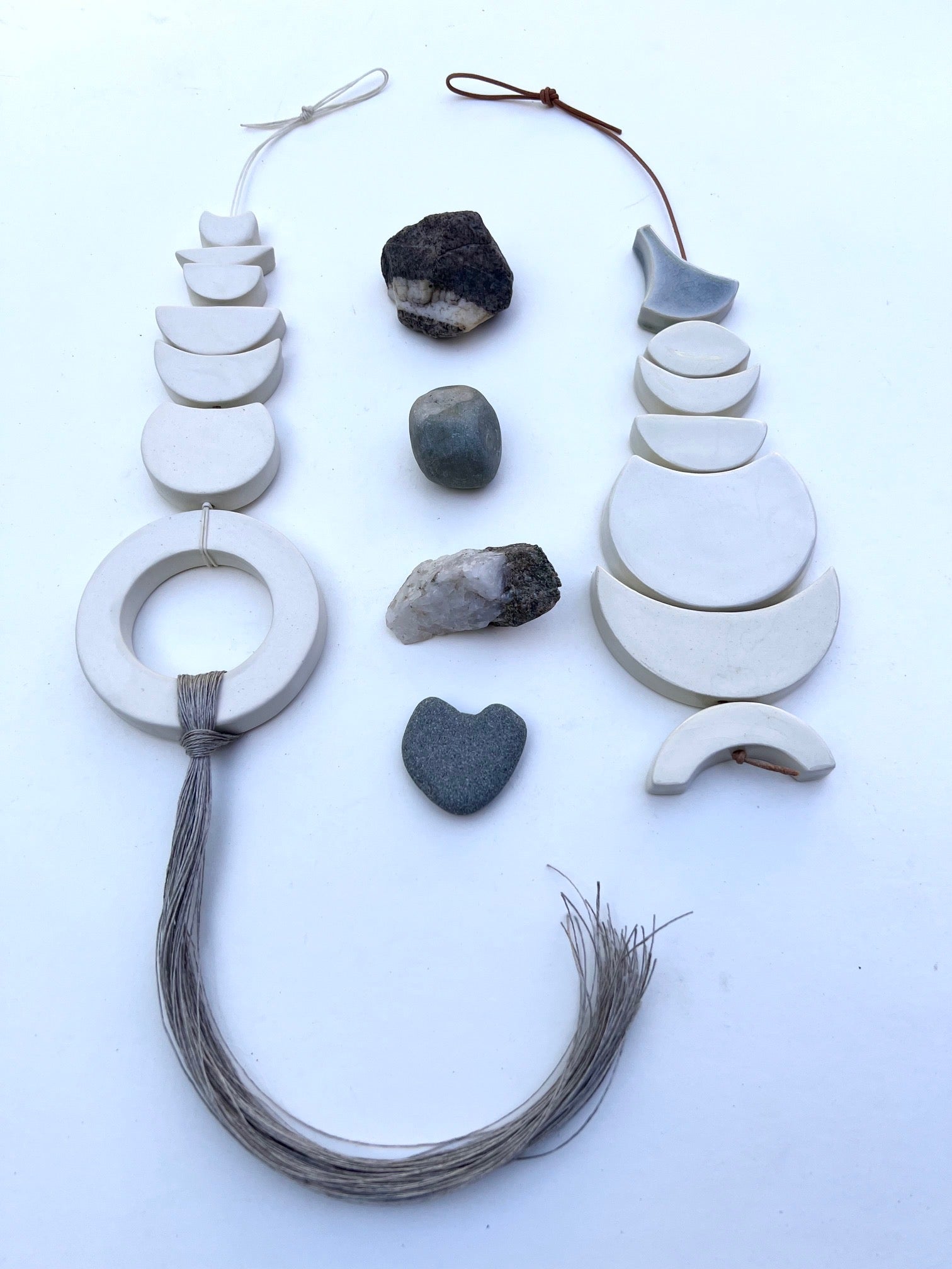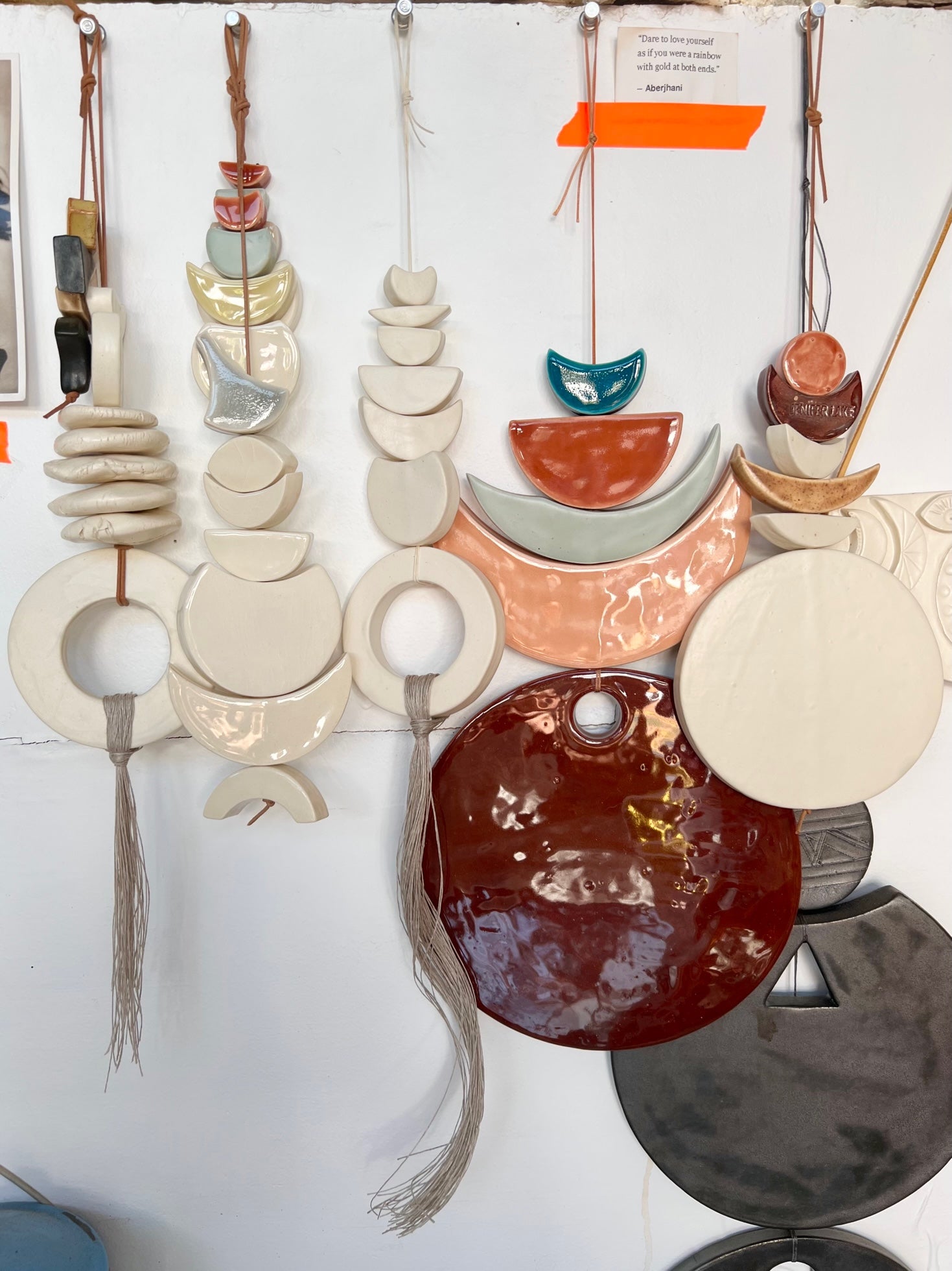 each & every piece of these wall hangings are cut, cleaned, sanded, designed, fired twice, & glazed by hand. the pieces are all fairly chunky & glazed with beautiful, full range colors; some with crackles, some with speckles & all unique. they are strung on strong leather cord & come ready to hang. all of my glazes are non-toxic.