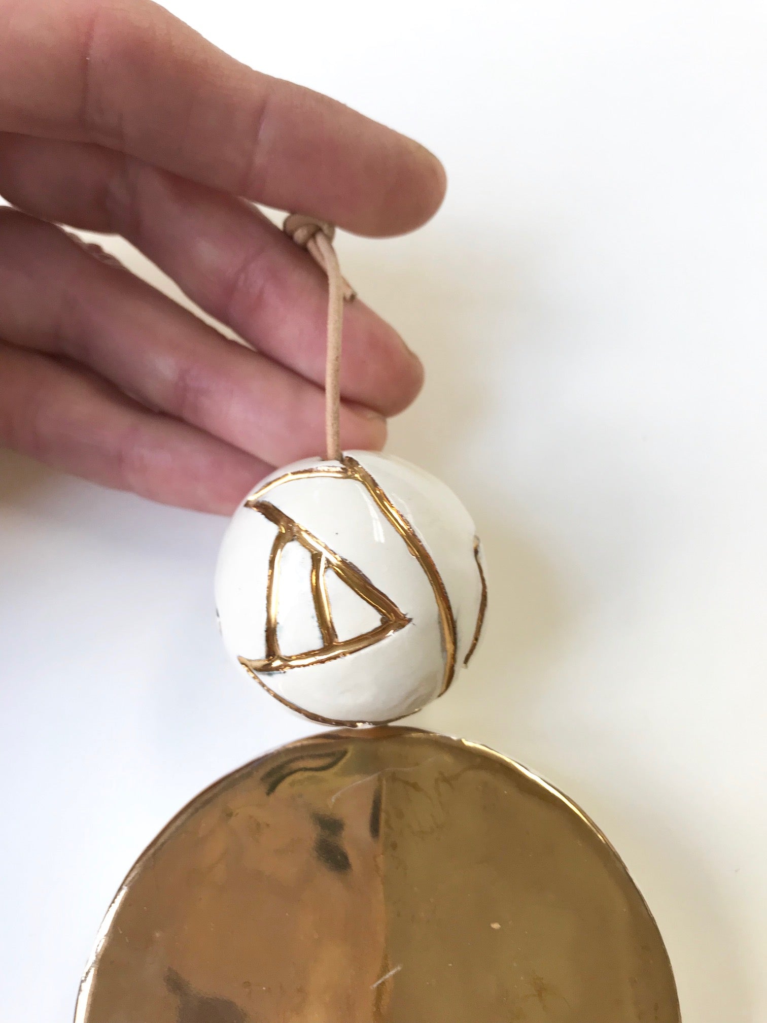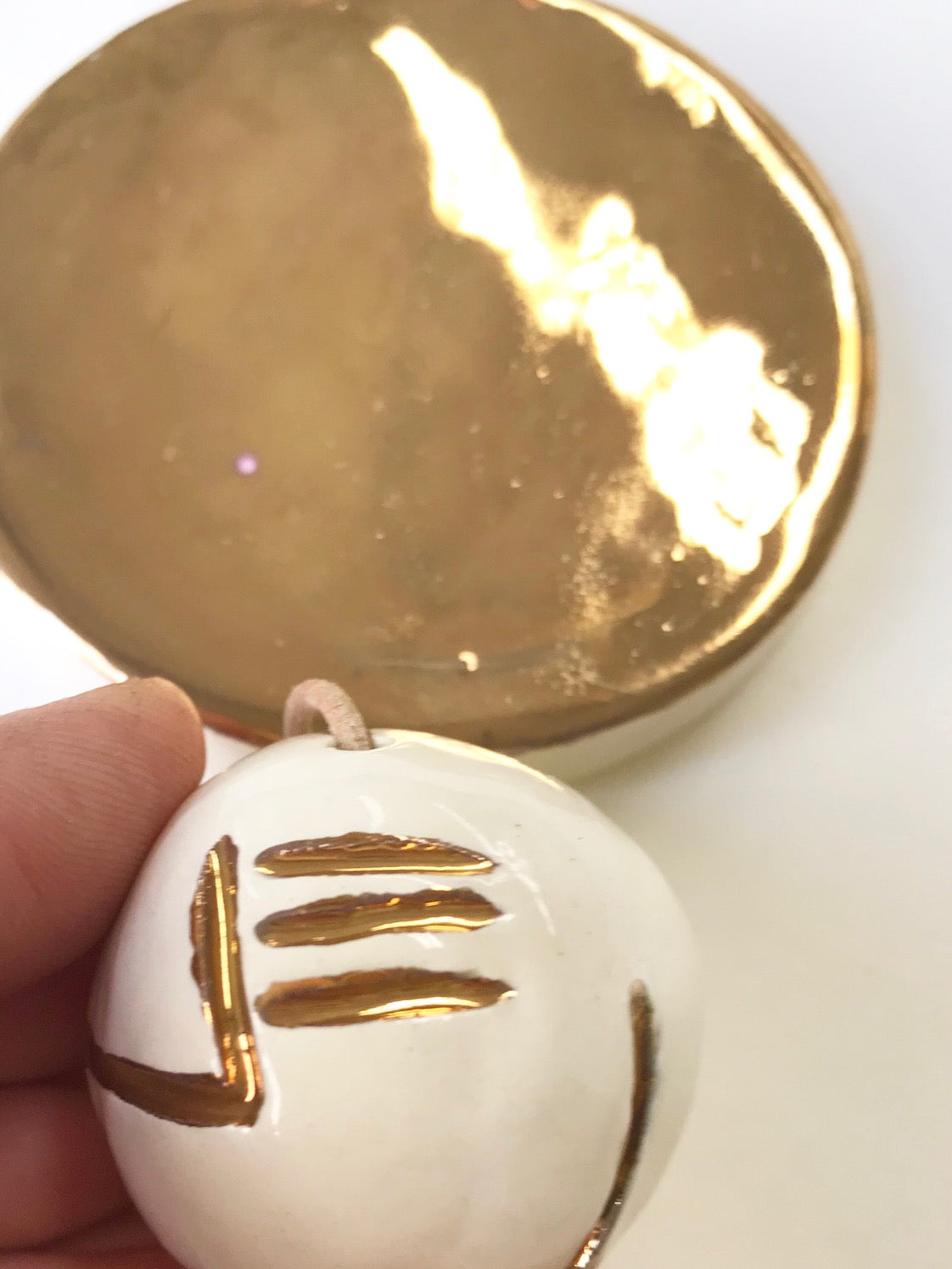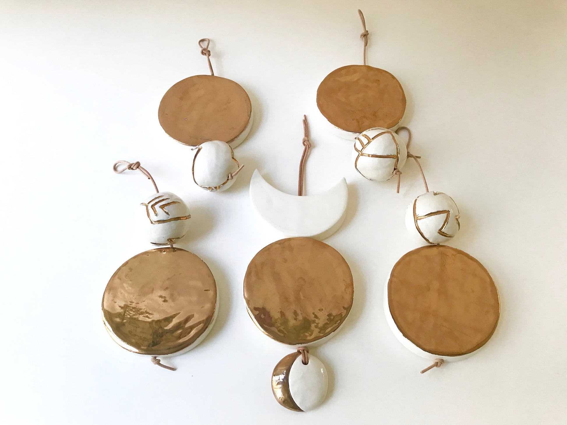 this golden moon center piece hanging is adorned with an aztec inspired design on the bead; & each bead has a custom, different design - it hangs on tan, leather cord. each & every piece of these wall hangings are cut, cleaned, dried, fired, glazed by hand, sanded & fired again. the gold piece & gold designs on the bead are a beautiful, metallic overglaze & in total this has been fired 3 times. the gold content is 8% true gold. these are part of my ongoing moon inspired wall hanging series.