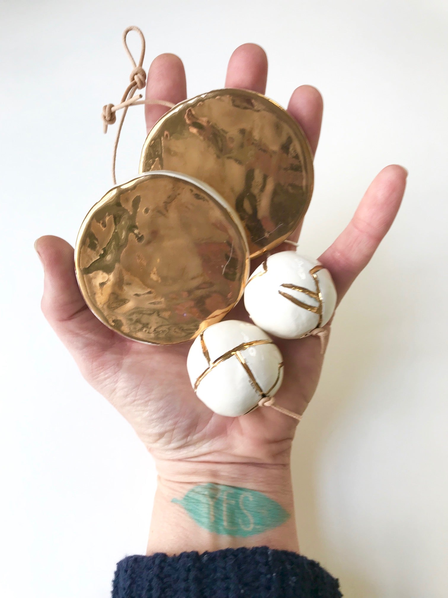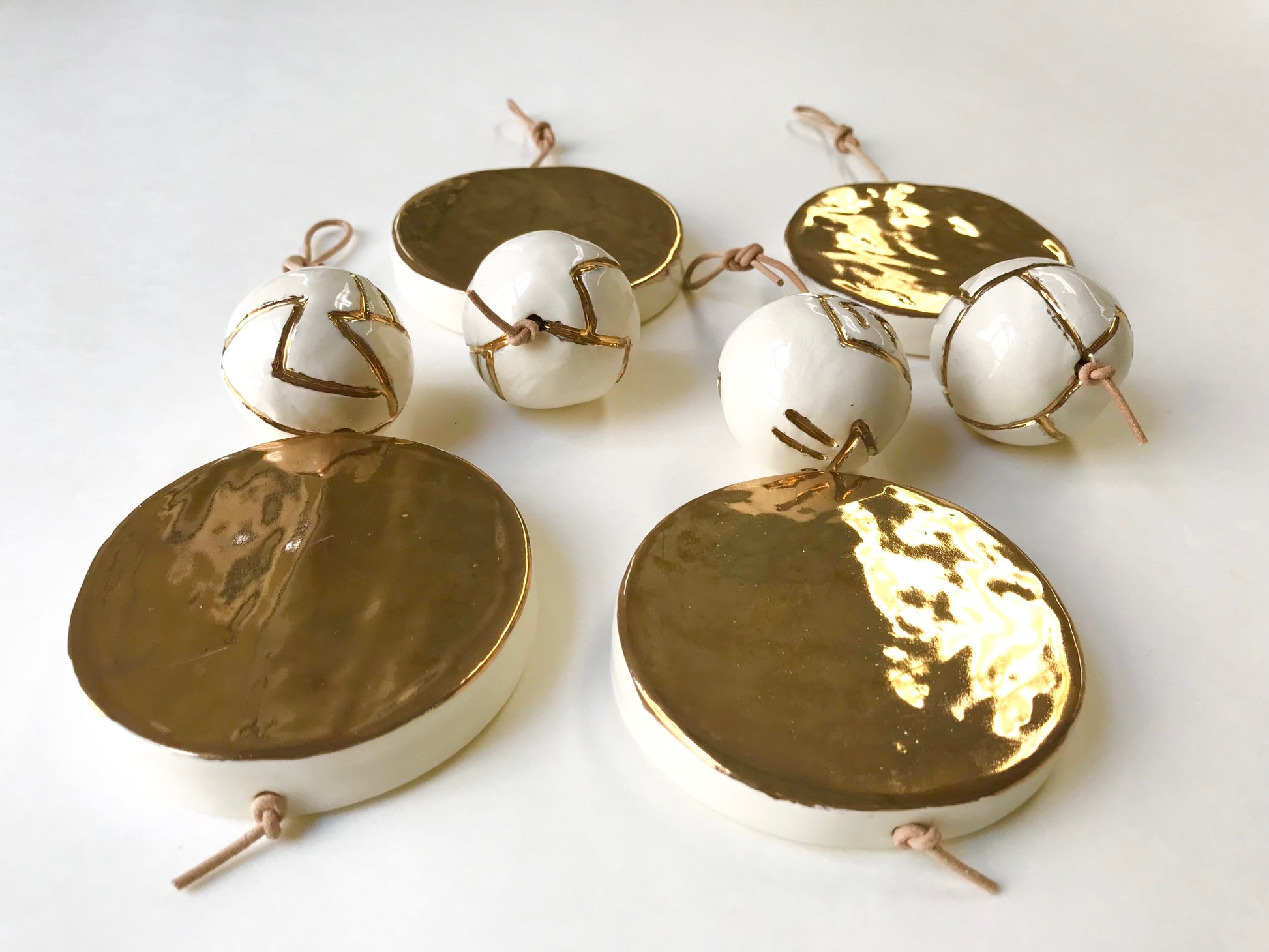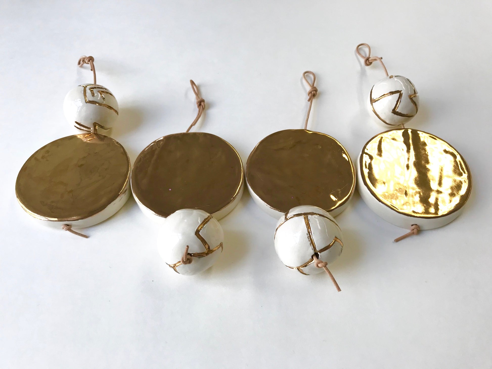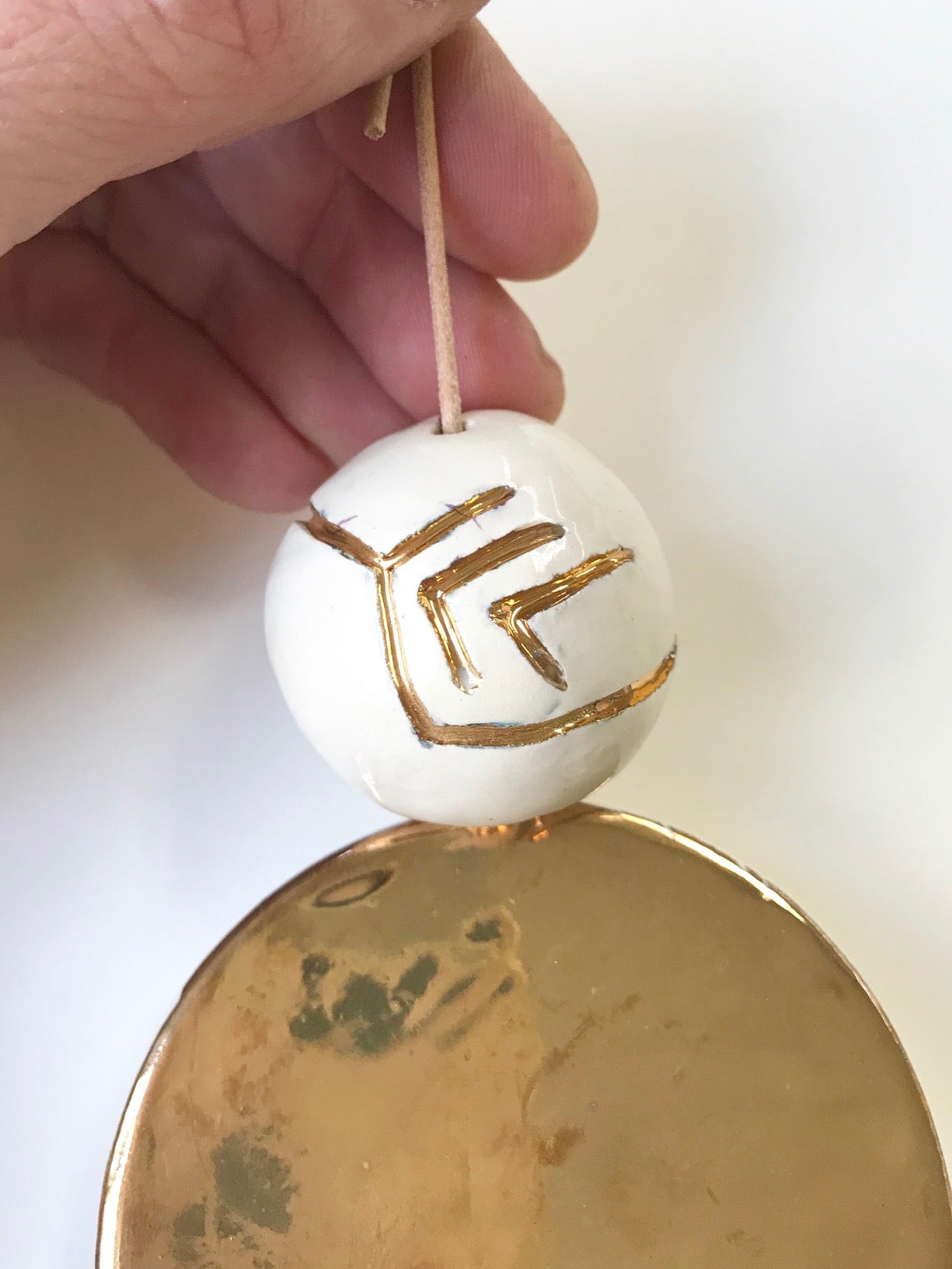 this golden moon center piece hanging is adorned with an aztec inspired design on the bead; & each bead has a custom, different design - it hangs on tan, leather cord. each & every piece of these wall hangings are cut, cleaned, dried, fired, glazed by hand, sanded & fired again. the gold piece & gold designs on the bead are a beautiful, metallic overglaze & in total this has been fired 3 times. the gold content is 8% true gold. these are part of my ongoing moon inspired wall hanging series.