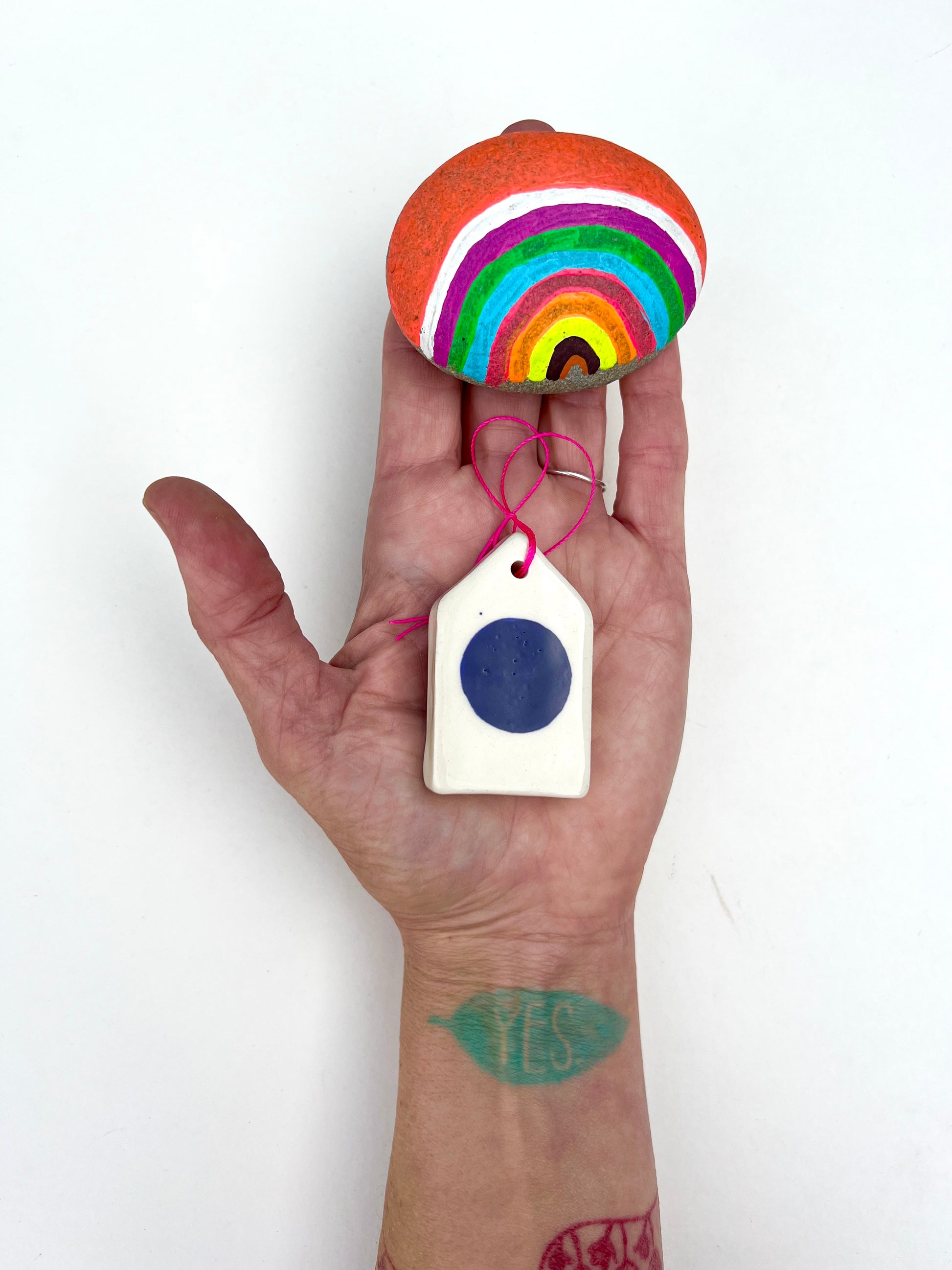 1 stoneware handmade house ceramic ornament glazed with a perfect cobalt circle; this color is so calming & peaceful to me.  reminds me of my beloved ocean spaces & home; when i'm near the water, i feel at home.  these pieces are strung on hot neon pink cording.  the ceramic pieces are cut, cleaned, painted, glazed, sanded & fired twice by me.  all pieces are handmade by me in my ceramic studio & i use only non-toxic, lead free glazes.